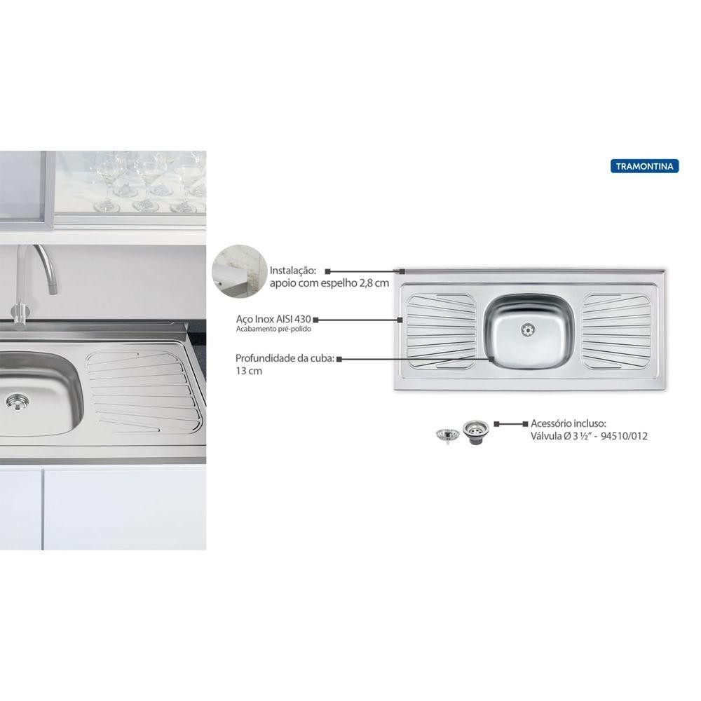 Pia de Apoio Tramontina New Raggi 40 em Aço Inox 120 x 52 cm Tramontina Para um dia a dia mais prático, a Tramontina oferece a Pia de Apoio Tramontina New Raggi 40 em Aço Inox 120x52 cm. Trata-se da solução completa para a sua residência ou empresa. Com 120x52 cm de tamanho e uma pia com 13 cm de profundidade e escorredor para louças, esta peça se adapta a todos os tipos de bancadas e se destaca pelo alto grau de acabamento, beleza e qualidade.Fabricada em Aço Inox 430 com acabamento pré-polido e 0,6 mm de espessura, a peça é inteiriça (sem solda), evitando pontos de corrosão e acúmulos de detritos. Especificações Técnicas: - Categoria: Standard - Comprimento: 120 cm - Largura: 52,5 cm - Altura: 13 cm - Medida(s) da(s) Cuba(s) (Comp. x Larg.): 40 x 34 cm - Capacidade: 13 L - Altura do Espelho: 2,8 cm - Furo para Torneira: Não - Material: Aço inox 430 - Espessura: 0,6 mm - Acabamento: Pré-polido - Aplicação: Apoio - Acompanha Válvula: Sim - Válvula com escape/ladrão: Não - Posicionamento da válvula: Descentralizada - Furação da válvula: 3.1/2" - Aceita triturador: Não - Acabamento da válvula: Econômica com pino plástico - Monobloco: Sim - Anti-ruído: Sim - Ambiente: Cozinhas - Pia com 1 central cuba + escorredor. - Aço Inox AISI 430.0,6 mm de espessura - Capacidade: 13 L - Acabamento pré-polido. - Acompanha válvula de 3 1/2" - Peso: 3,95 kg - Marca: Tramontina Recomendações de Uso: - Para um perfeito funcionamento da pia, montar inicialmente a válvula e, após, fixar a pia no gabinete. - O aço inox AISI 430 é mais suscetível a corrosão e requer maiores cuidados com a manutenção e limpeza, para garantir a conservação e vida útil do produto. - Em regiões litorâneas a Tramontina recomenda o aço inox AISI 304. - Remover a etiqueta colada dentro da pia.Limpar a pia com detergentes normais neutros.Usar somente esponja macia ou pano para lavar a pia. - Esta peça contém bordas cortantes. - Manusear com cuidado. - Não usar ácido muriático, água sanitária ou qualquer outro solvente para lavar objetos na pia. - Na reforma ou construção, proteger a pia para não deixar sobre a peça pó de cimento ou gesso. - Enxaguar e secar bem a peça após o uso. Aviso sobre o produto: - Imagem Meramente Ilustrativa - Garantia do fabricante: 12 meses para vícios ou defeitos de fabricação