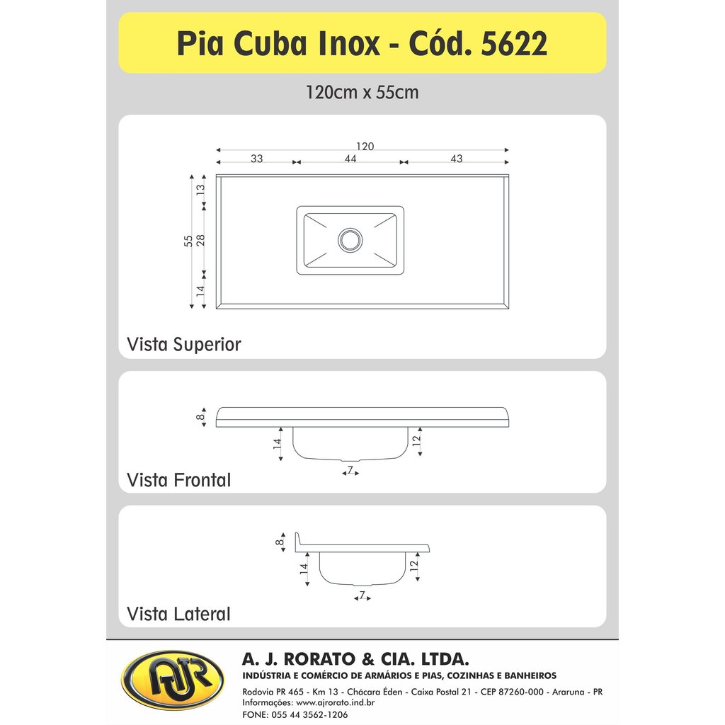 Produto em mármore sintético com espessuras reforçadas, com cobertura granitada de gel coat com brilho e resistência incomparáveis e cuba de aço inox com 14cm de profundidade. superfícies mais lisas sem porosidade proporcionando maior higiene e fácil limpeza. pias com protetor de parede e caneletas altas, evitando o derramamento acidental de água. Peso (kg): 16.1 Garantia: 03 Meses Altura (cm): 14 Largura (cm): 120 Espessura (mm): 6 Tipo de Cuba: Simples Profundidade (cm): 55 Acompanha Válvula: Não Origem do Produto: Nacional Ambiente Principal: Cozinha Acompanha Manual de Instalação: Sim Acabamento (Construção e Acabamento): Com Brilho Material Principal Construção e Acabamento: Mármore Sintético Marca: AJ Rorato Cor: Gelo Itens Inclusos: 1 Pia em mármore Sintético com cuba em aço inox embalado com cantoneiras de isopor e papelão Válvula Indicada: A válvula indicada para a Pia de cozinha Cuba Inox é o modelo Americano, com a bitola de 3 ½ x 1 ½ polegadas. E o diâmetro aproximado de 8,9 cm do topo e de 4,5 cm do pescoço. Podendo ser plástica e/ou cromada.