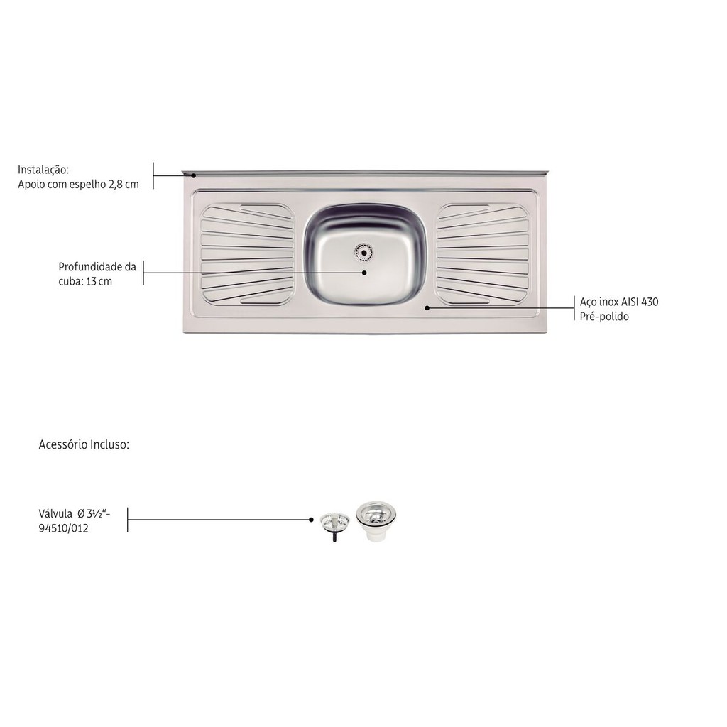Para um dia a dia mais prático, a Tramontina oferece a Pia de Apoio Tramontina New Raggi 40 em Aço Inox 120x52 cm. Trata-se da solução completa para a sua residência ou empresa. Com 120x52 cm de tamanho e uma pia com 13 cm de profundidade e escorredor para louças, esta peça se adapta a todos os tipos de bancadas e se destaca pelo alto grau de acabamento, beleza e qualidade.Opcionalmente são oferecidos acessórios como, tábua em madeira, grade aramada, dosador de sabão e cesta quadrada. Fabricada em Aço Inox 430 com acabamento natural e 0,6 mm de espessura, a peça é inteiriça (sem solda), evitando pontos de corrosão e acúmulos de detritos. Pia com 1 central cuba + escorredor.Aço Inox AISI 430.0,6 mm de espessura.Capacidade: 13 LAcabamento natural.Acompanha válvula de Ø 3 1/2".Todas as imagens são meramente ilustrativas. Para um perfeito funcionamento da pia, montar inicialmente a válvula e, após, fixar a pia no gabinete.O aço inox AISI 430 é mais suscetível a corrosão e requer maiores cuidados com a manutenção e limpeza, para garantir a conservação e vida útil do produto.Em regiões litorâneas a Tramontina recomenda o aço inox AISI 304.Remover a etiqueta colada dentro da pia.Limpar a pia com detergentes normais neutros.Usar somente esponja macia ou pano para lavar a pia.Esta peça contém bordas cortantes. Manusear com cuidado.Não usar ácido muriático, água sanitária ou qualquer outro solvente para lavar objetos na pia.Na reforma ou construção, proteger a pia para não deixar sobre a peça pó de cimento ou gesso.Enxaguar e secar bem a peça após o uso.Nunca deixar objetos metálicos sobre a peça por períodos muito longos, para evitar a corrosão.Para manter o brilho da sua pia, recomendamos o uso da pasta para polir e remover manchas em superfícies de aço inoxidável Tramontina. O aço inox AISI 430 é mais suscetível a corrosão e requer maiores cuidados com a manutenção e limpeza, para garantir a conservação e vida útil do produto .Em regiões litorâneas a Tramontina recomenda o aço inox AISI 304.
