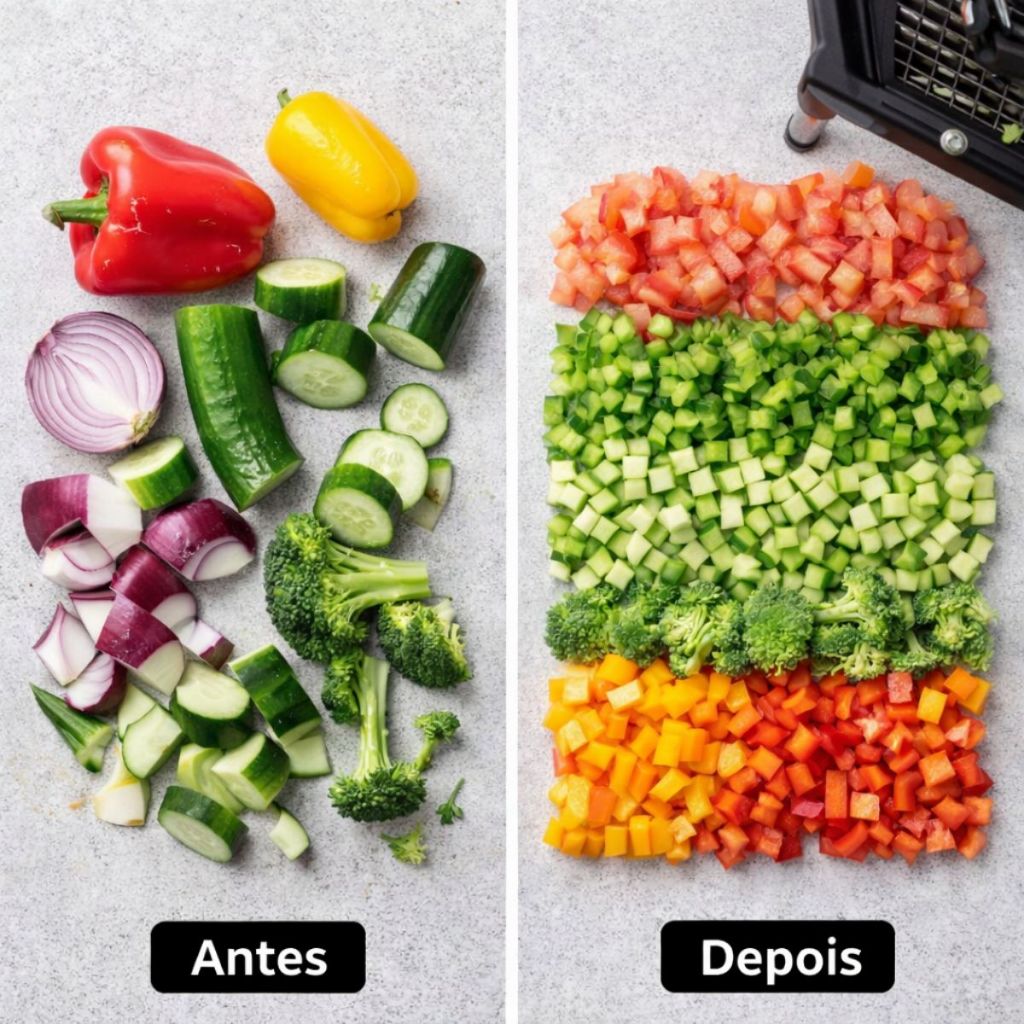 🥕 Picador de Legumes Profissional Smart Gourmet 10mm Corte Preciso • Alta Resistência • Padrão Restaurante Se você quer agilidade, padronização e acabamento profissional, o Picador de Legumes Smart Gourmet é a escolha certa. Ideal para cozinhas domésticas exigentes, lanchonetes, restaurantes e produção em grande volume. ✅ Por que escolher o Picador? 🔪 Corte Profissional de 10mm Cubos padronizados, uniformes e perfeitos. ⚡ Muito Mais Rápido que Corte Manual Economiza tempo e aumenta sua produtividade. 💪 Estrutura Super Resistente: Fabricado em nylon reforçado de alta durabilidade. Lâminas em Aço Inox Afiadas Corte preciso e longa vida útil. Base com Pés Emborrachados Mais estabilidade e segurança no uso. Sistema com Mola Caracol Reduz o esforço físico e facilita o manuseio. 📏 Especificações Técnicas: Altura Total: 40 cm Altura dos Pés: 10 cm Comprimento: 38 cm Largura: 20 cm Abertura de Corte: 9 cm Espessura do Corte: 10 mm (fixo e padronizado) Material: Nylon reforçado + lâminas em aço inox Sistema: Mola caracol de alta eficiência 📦 Conteúdo da Embalagem: ✔ 1 Picador de Legumes Smart Gourmet Completo Produto com 3 meses de garantia contra defeitos de fabricação. 🔥 Ideal Para: Restaurantes Lanchonetes Produção de marmitas Saladas em grande volume Quem busca padrão profissional em casa: 🚀 Mais produtividade. 🎯 Mais padrão. 💼 Resultado profissional. Estoque limitado. Garanta agora o seu!