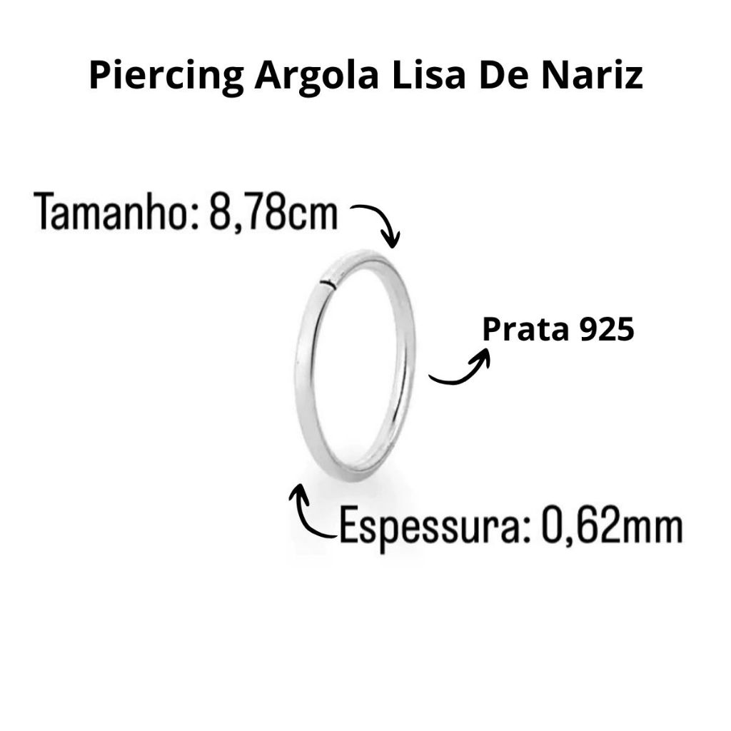 Piercing Argola Lisa De Nariz - Prata 925 Legítima. Características do produto: - Material: Prata 925; - Tamanho: 8mm interno e 8,78mm externo; - Espessura: 0,62mm; - Piercing liso; - Perfeito para ser usado no nariz, dependendo do tamanho do seu furo no septo também dá certo; - Fecho modelo torção; - Acompanha 1 unidade do piercing; Nossas peças de prata são a escolha perfeita para você ou para presentar alguém especial em sua vida, irá surpreender e encantar para se usar em qualquer ocasião! Cuidados com sua peça: Evite o contato com produtos químicos, materiais de limpeza, mar e piscina. Limpe apenas com flanela. Guarde-as individualmente para evitar atritos. Dúvidas mais frequentes: É prata mesmo ou é banhada? Todas nossas joias são feitas em prata 925 legítima. A foto da joia é ilustrativa? Todas as nossas fotos anunciadas são reais. É exatamente a joia que você vai receber. Posso tomar banho com ela? Pode, mas aconselhamos evitar pois alguns sabonetes e shampoos possuem enxofre em sua composição e pode acabar oxidando a prata. Dúvidas nos chame no chat que iremos te responder o mais breve possível!