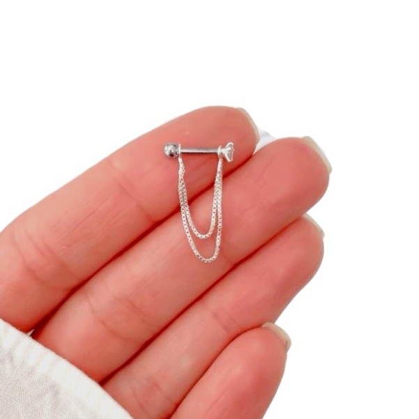 ✨ Piercing para Conch ou Helix com Correntes em Prata 925 e Haste de Aço Cirúrgico ✨ Um acessório delicado e sofisticado que valoriza ainda mais sua orelha! Ideal para quem ama um toque moderno sem abrir mão da elegância. 🔹 Material: Frente em prata 925 com ponto de luz de zircônia brilhante. Correntes finas e elegantes em prata 925 (disponível com 2 ou 3 fios). 🔹 Haste: Aço cirúrgico resistente, com tamanho de 8mm e espessura de 1.2mm — indicado para perfurações como conch e helix. 🔹 Fecho: Rosqueável, seguro e prático. 🔹 Uso Recomendado: Para perfurações cicatrizadas. 💎 Cuidados com a Prata 925: Evite contato com água salgada, piscina e produtos químicos. Guarde em local seco e protegido da luz para evitar oxidação. Para manter o brilho, utilize flanela de polimento própria para prata. 💬 Em caso de dúvidas, estamos à disposição no chat! Escolha o modelo com 2 ou 3 fios e destaque sua orelha com estilo e delicadeza. 💖