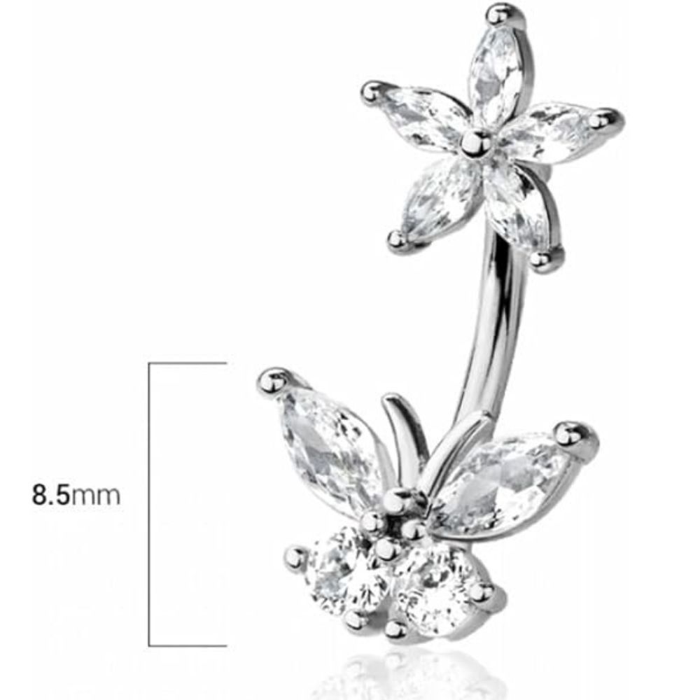 Piercing de Umbigo com Flor e Pingente Borboleta em Zircônia-Prata