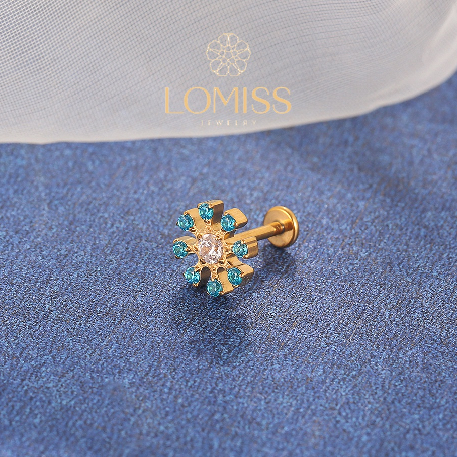 Piercing Helix Conch Labret Titânio PVD Flor Zircônia AZUL《Lomiss semijoias》