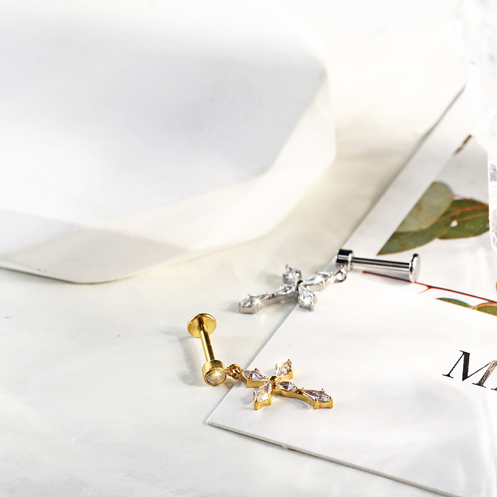 Piercing Helix Labret Titânio Com Cruz Pingente Tragus 6 Zircônia | Rosca Interna Boca Lateral Conch Flat Nariz Lóbulo