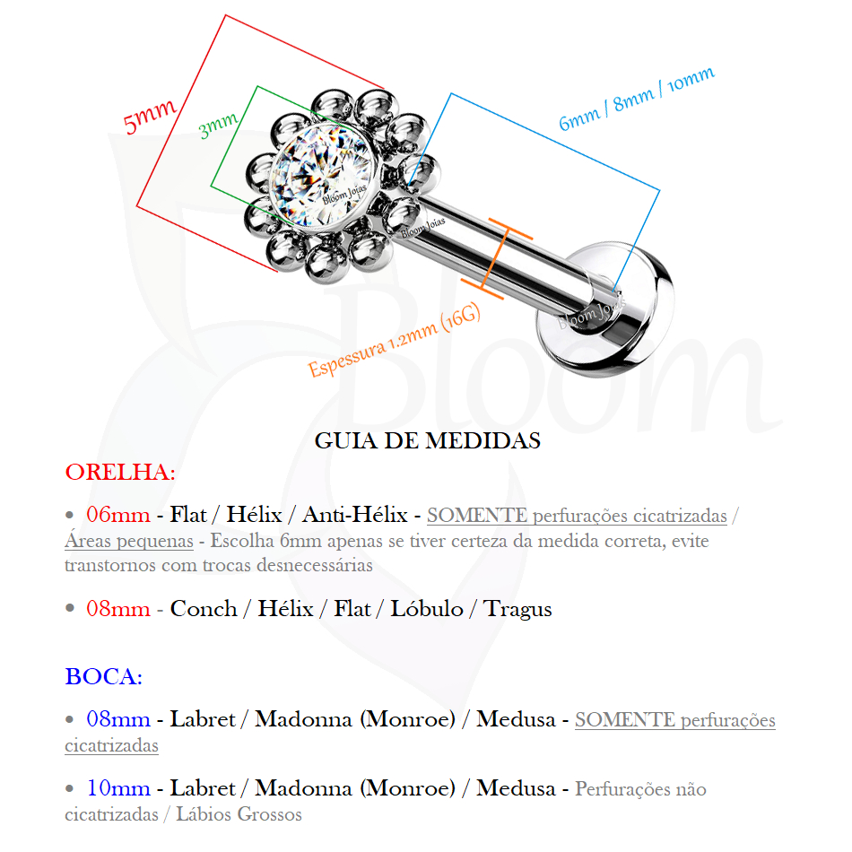 .:: Bloom Joias e Body Piercings ::. Bem Vindo :) O TITÂNIO é mais forte, leve e resistente a corrosão do que o aço inoxidável. Apresenta maior biocompatibilidade do que outros metais, como ouro, prata e aço cirúrgico. É livre de níquel, não causa reações na pele ou alergias. Body Piercing 100% Titânio - HIPOALERGÊNICO / ANTIALÉRGICO - Labret com Zircônia Cluster Bolinhas Indiano / Flor / Para Tragus / Flat / Labret / Medusa / Monroe / Conch / Helix / Entre outros Tamanho da Haste: 6mm / 8mm / 10mm Pedra: 3mm Tamanho total do topo: 5mm Rosca Interna \\\ Valor referente 1 unidade ///