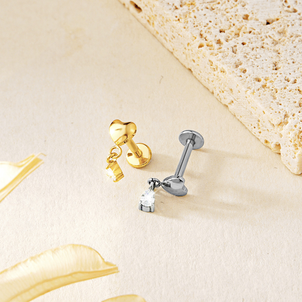 Piercing Labret Orelha Titânio Pvd Coração Pingente Gota Zircônia Cravejado Para Tragus Conch Helix Daith Labret Lateral