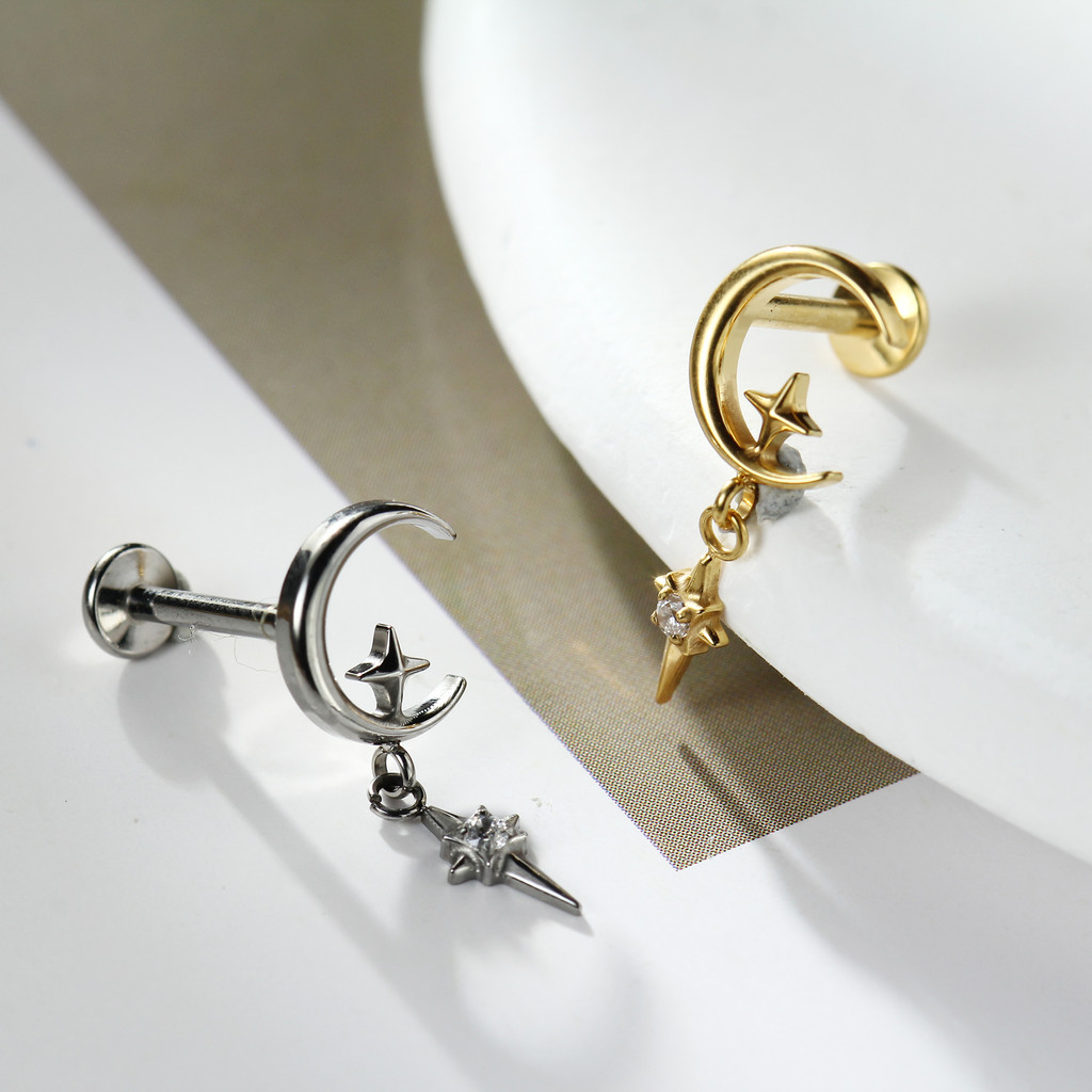 Piercing Labret Titânio Lua Estrela Zircônia Cravejada Tragus Conch Helix Orelha Nariz