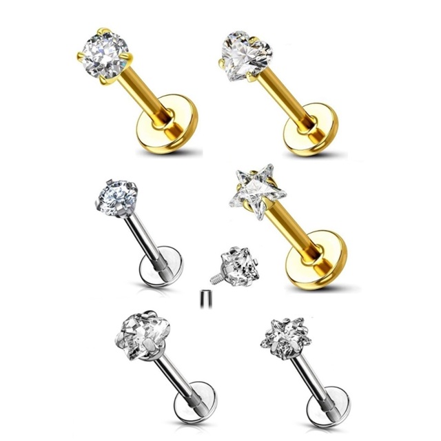 Piercing Labret Zircônia 8mm OU 6mm AÇO Cirúrgico Coração ou Estrela ou Redondo
