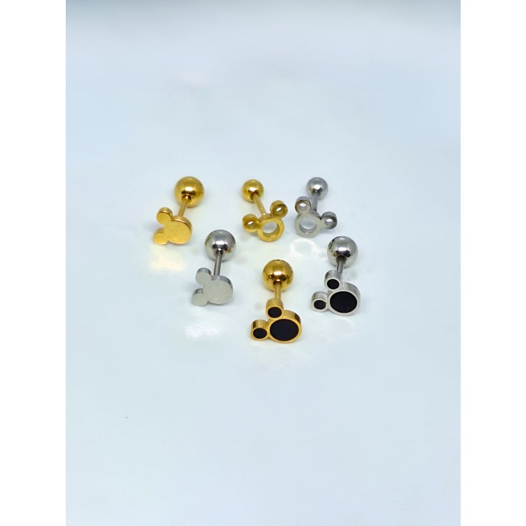 Especificaçoes do Piercing Modelo Mickey Mouse. Tipo De Piercing : Tragus, Hélix Cartilagem, Flat, Lobulo. Tamanho da Haste : 6.0mm Espessura da Haste : 1.0mm Tipo de Fecho : Bolinha Rosca Externa Material : Aço Cirurgico - Prata e Dourado
