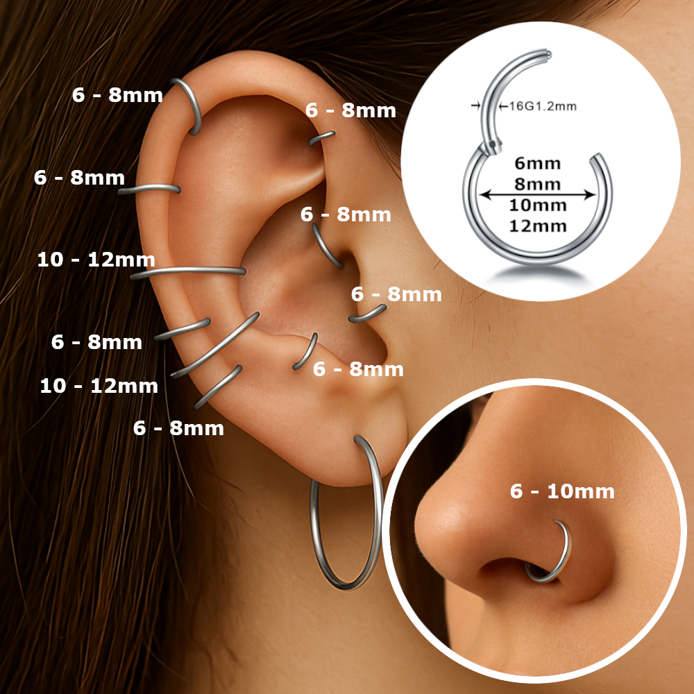 Produto no Brasil Piercing Argola Titânio G23 Clicker LISA; Cores DOURADO (Gold PVD) e PRATEADO (natural); Fecho clicker; Fácil colocação e remoção; Não escurece; Não oxida; Resistente à água do mar, piscina e banho; Evita inflamações e alergias; Tamanhos: Espessura 1.2mm; - 6 mm: Trágus, Anti-Trágus, Rook, Snug, Daith - 8 mm: Hélix, Trágus, Daith, Rook, Septo, Íntimo, Umbigo - 10 mm: Hélix, Rook, Conch, Flat, Septo, Íntimo - 12 mm: Conch, Flat Envio em menos de 24hs