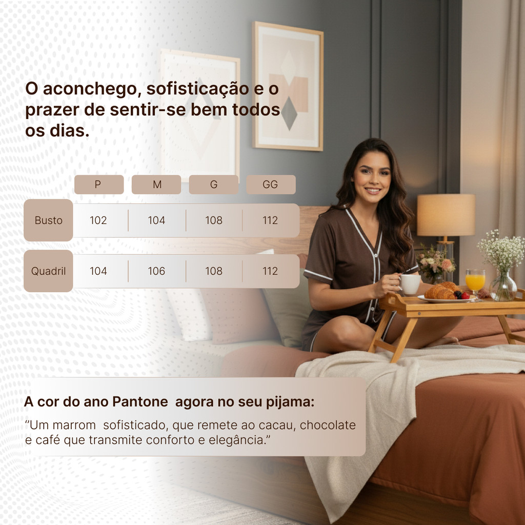 Pijama Americano Marrom: Uma Experiência de Luxo para Seu Descanso Desperte um novo sentido para o seu ritual de relaxamento com o Pijama Americano. Aclamado por blogueiras e ícones da moda por sua elegância atemporal, ele é a sua peça-chave para noites de sono serenas e manhãs inspiradoras. Confeccionado em malha PV, sua sutil semi-transparência e toque super fresquinho proporcionam uma sensação de leveza e sensualidade, transformando suas noites em momentos de puro deleite. Apresentamos este item na cor Marrom, um tom que exala elegância discreta e refinamento. Cada detalhe foi pensado para o seu bem-estar. O design de botões não apenas confere um charme atemporal, mas também oferece praticidade, sendo ideal para a fase da amamentação. A tecnologia que não pega pêlos mantém a peça com aparência de nova por mais tempo. Além disso, a composição que não desbota e o short com ajuste em elástico na cintura garantem durabilidade e conforto em cada uso. GUIA DE TAMANHO: P (36-38) M (40-42) G (42-44) GG (44-46) Tecido: Malha de toque suave Composição: 100% Poliéster Tecnologia: Não pega pêlos Cor: Marrom Perguntas e Respostas O tecido é transparente? R: Ele possui uma sutil semi-transparência, característica que adiciona leveza e delicadeza à peça. O pijama pega pêlos? R: Não, nossa tecnologia de tecido foi desenvolvida para que a peça não pegue pêlos Cuidado e Garantia COMO CUIDAR: Lave no ciclo delicado e seque à sombra para preservar a cor e o toque luxuoso. GARANTIA: Oferecemos garantia incondicional de 7 dias. Se não amar, é só devolver. Referência de qualidade e acabamento no Brasil. Entrega rápida e garantida! Qualquer dúvida estamos à disposição no chat! Equipe, Shanty Lingerie!