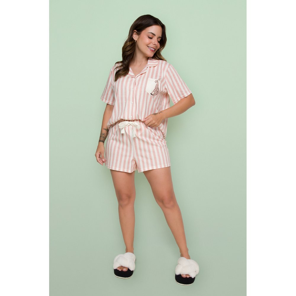 Pijama Americano Blogueirinha Manga Curta 100% Algodão Listra Salmão