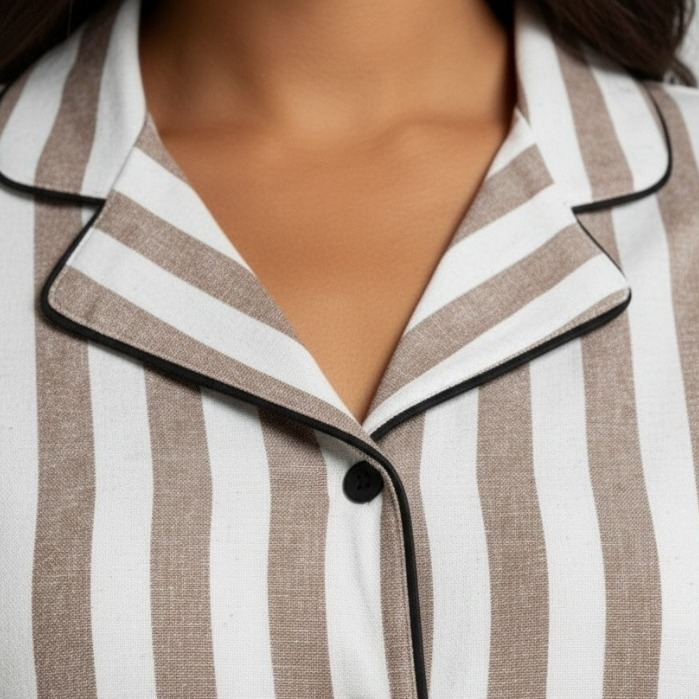 Pijama Feminino Curto Listrado 100% Algodão – Fruto Proibido Se você procura um pijama bonito e confortável de verdade, esse é o modelo certo. Nada de tecido quente, áspero ou que deforma depois da lavagem. Confeccionado em 100% algodão, esse pijama oferece toque macio, respirabilidade e conforto real para dormir ou ficar em casa com estilo. O conjunto conta com: Camisa de mangas curtas com abotoamento frontal Gola estilo pijama clássico Detalhes em vivo contrastante que elevam o acabamento Short com cós confortável, sem apertar O design listrado traz um visual elegante e atemporal — não é pijama “sem graça”, nem exagerado. ✔️ Diferenciais do produto 100% Algodão: não esquenta e permite a pele respirar Conforto para dormir e para uso diário Modelagem confortável, não marca o corpo Acabamento bem-feito e visual sofisticado Ideal para todas as estações Composição Tecido: 100% Algodão 🏷️ Loja Fruto Proibido Se a sua cliente busca conforto de verdade, esse produto entrega. Não é pijama descartável — é peça para uso frequente.