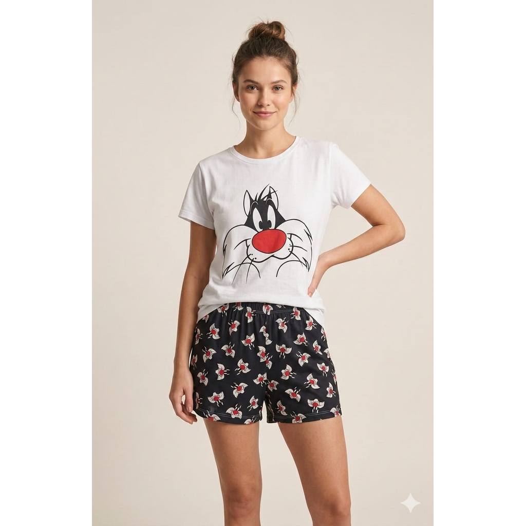 Pijama Baby Doll Manga Curta Personagens Gatinho Frajola