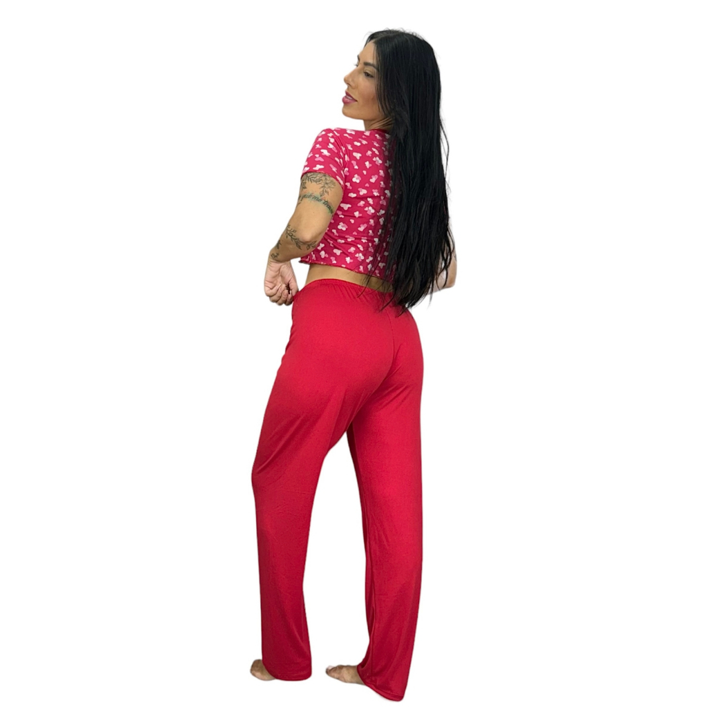 Pijama Cropped Estampado e Calça Lisa Confortável Adulto Moda Noturna Feminino