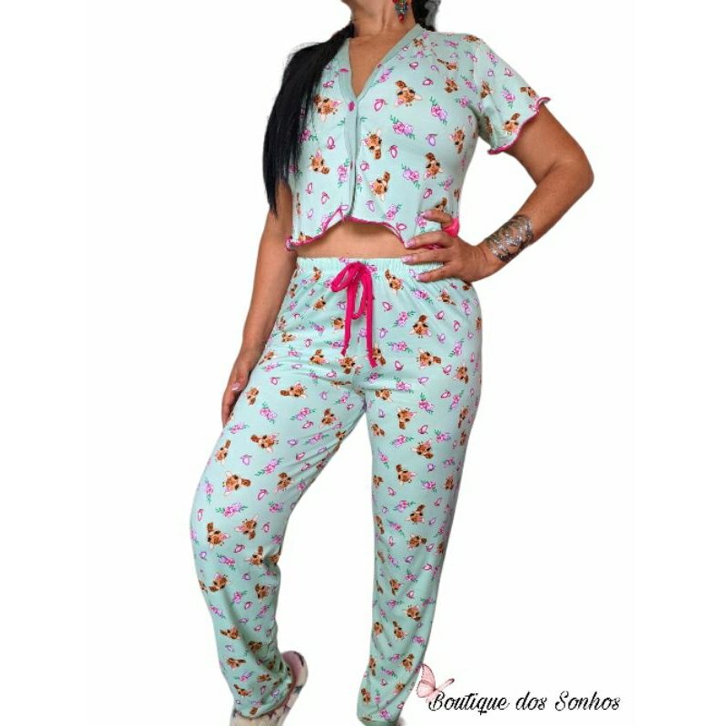 Pijama cropped Suede feminino ondinha verão blogueirinha americano botão amamentação pós cirurgico pós parto linha noite