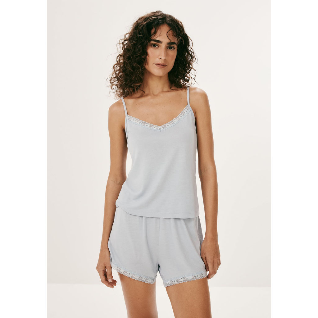 Pijama curto feminino com renda, conforto e praticidade para seus momentos de descanso. Pijama elaborado em malha de viscose, composto de regata e shorts curto, ambos com acabamento em renda que garante um ar sofisticado e delicado.Detalhes da regata:Em malhaModelagem regularAlças finasDecote VDetalhe de renda no decoteDetalhes do shorts:Em malhaModelagem retaCintura altaCós de elástico Detalhe de renda na barra