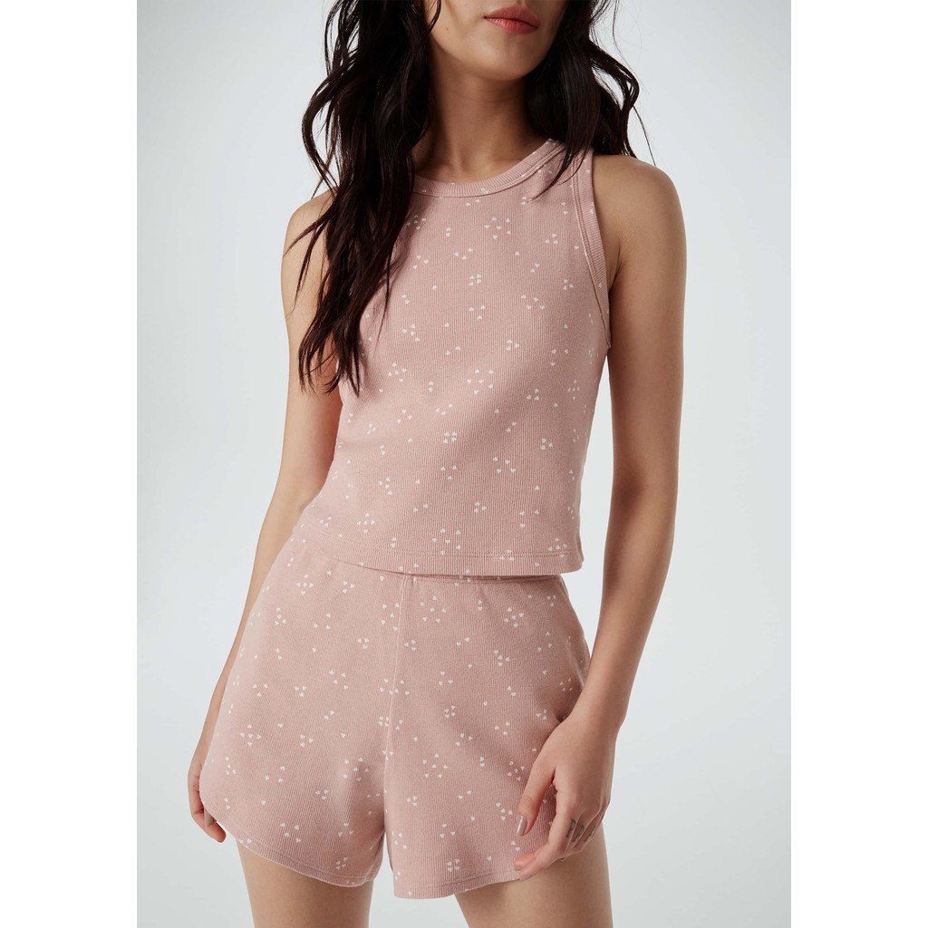 Pijama curto feminino estampado, elaborado em malha de ribana, que possui uma textura canelada e elástica. É Durável e muito confortável, composto por uma regata nadador e um shorts com cós de elástico. Ambos se destacam pelo seu estampado romântico e delicado.O pijama canelado propõe um estilo mais funny, com mood jovial e divertido pelas suas cores alegres e vibrantes! Detalhes da regata:Em ribanaCaneladaModelagem slimCostas nadadorAlças largasDetalhes do shorts:Em ribanaCaneladaModelagem retaCintura altaCós de elástico