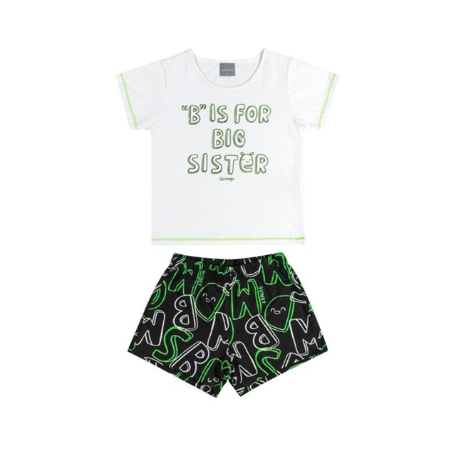 "Pijama infantil para menina composto por uma blusa e um short, ambos confeccionados em meia malha, garantindo maciez e suavidade para uma noite de sono tranquila. A blusa apresenta uma gola redonda confortável e mangas curtas que permitem maior liberdade de movimento durante o sono. A estampa é o destaque, com elementos em 3D e a escrita ""B is For Big Sister"", criando um visual encantador que as meninas vão adorar. O short complementa o conjunto com seu cós elástico na cintura, proporcionando um ajuste confortável e prático. A estampa de letrinhas dá um toque divertido e descontraído ao conjunto. Deixe-as aproveitarem suas noites de sono com conforto e estilo com este conjunto encantador."Fechamento: ElásticoTecido: Meia MalhaComposição: BLUSA: 100% algodão | SHORT: 100% algodãoCintura: MédiaDecote/Gola: RedondaModelagem: AmplaForro: NãoComprimento Manga: Curta