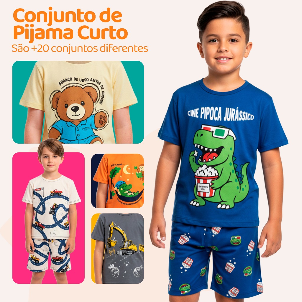 Pijama Infantil Masculino Verão – Manga Curta + Bermuda | 100% Poliéster** Conforto e leveza para noites tranquilas e divertidas O **pijama infantil masculino de verão** foi desenvolvido para oferecer conforto e liberdade em noites quentes. Com **tecido leve e toque suave**, é ideal para o dia a dia, proporcionando frescor e bem-estar para o seu pequeno. Neste anúncio, o comprador pode **escolher entre mais de 10 modelos diferentes**, com estampas alegres e divertidas. Monte o kit ideal de acordo com o gosto e estilo da criança. --- Detalhes do Produto - Camiseta de **manga curta**, com gola reforçada - Bermuda com **elástico confortável na cintura** - Confeccionado em **100% poliéster** – leve, macio e de secagem rápida - Estampas exclusivas com temas infantis - Ideal para o verão e dias de calor --- Tabela de Medidas Camiseta* Tam 1 – Busto 26 cm | Comprimento 35 cm Tam 2 – Busto 27 cm | Comprimento 37 cm Tam 3 – Busto 28 cm | Comprimento 38 cm Tam 4 – Busto 32 cm | Comprimento 45 cm Tam 6 – Busto 35 cm | Comprimento 46 cm Tam 8 – Busto 36 cm | Comprimento 49 cm Tam 10 – Busto 36 cm | Comprimento 52 cm Bermuda Tam 1 – Cintura 20 cm | Comprimento 26 cm Tam 2 – Cintura 21 cm | Comprimento 27 cm Tam 3 – Cintura 19 cm | Comprimento 27 cm Tam 4 – Cintura 24 cm | Comprimento 33 cm Tam 6 – Cintura 25 cm | Comprimento 34 cm Tam 8 – Cintura 24 cm | Comprimento 36 cm Tam 10 – Cintura 25 cm | Comprimento 37 cm *Pode haver pequena variação (±2 cm) devido ao processo de confecção.* --- Benefícios do Produto - Tecido leve e respirável - Conforto e liberdade para brincar e dormir - Secagem rápida e fácil manutenção - Estampas variadas com temas divertidos - Perfeito para o verão e climas quentes --- Dica Adicione mais de um modelo ao carrinho e **aproveite o mesmo frete** para montar um kit completo e variado de pijamas para o seu filho. --- Perguntas Frequentes 1. Posso escolher o modelo? Sim. Basta selecionar o modelo desejado no momento da compra. 2. O tecido é quente? Não. O poliéster é leve e fresco, ideal para noites de verão. 3. A bermuda tem elástico? Sim. Todas as bermudas possuem elástico confortável e ajustável na cintura. 4. As estampas desbotam com o tempo? Não. O tecido é resistente e mantém as cores vivas mesmo após diversas lavagens.