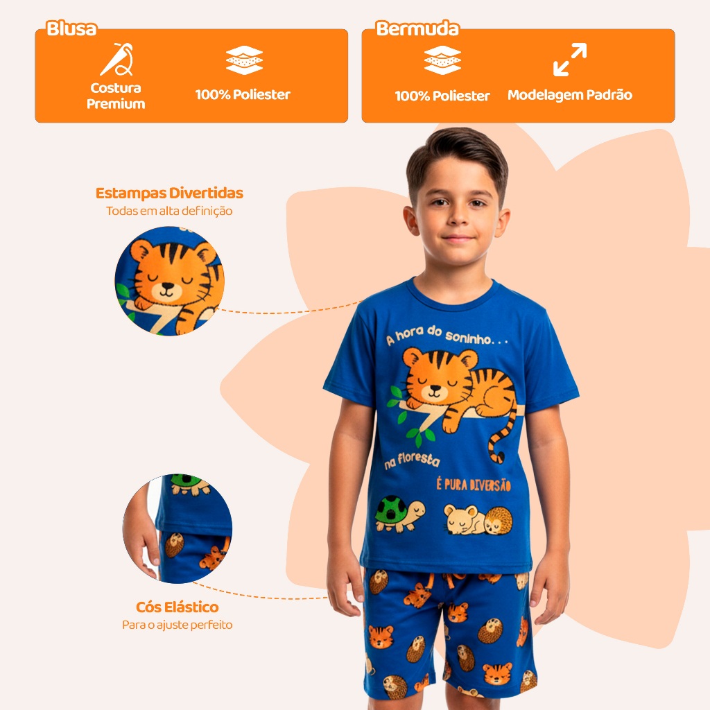 Pijama Infantil Masculino Verão – Manga Curta + Bermuda | 100% Poliéster** Conforto e leveza para noites tranquilas e divertidas O **pijama infantil masculino de verão** foi desenvolvido para oferecer conforto e liberdade em noites quentes. Com **tecido leve e toque suave**, é ideal para o dia a dia, proporcionando frescor e bem-estar para o seu pequeno. Neste anúncio, o comprador pode **escolher entre mais de 10 modelos diferentes**, com estampas alegres e divertidas. Monte o kit ideal de acordo com o gosto e estilo da criança. --- Detalhes do Produto - Camiseta de **manga curta**, com gola reforçada - Bermuda com **elástico confortável na cintura** - Confeccionado em **100% poliéster** – leve, macio e de secagem rápida - Estampas exclusivas com temas infantis - Ideal para o verão e dias de calor --- Tabela de Medidas Camiseta* Tam 1 – Busto 26 cm | Comprimento 35 cm Tam 2 – Busto 27 cm | Comprimento 37 cm Tam 3 – Busto 28 cm | Comprimento 38 cm Tam 4 – Busto 32 cm | Comprimento 45 cm Tam 6 – Busto 35 cm | Comprimento 46 cm Tam 8 – Busto 36 cm | Comprimento 49 cm Tam 10 – Busto 36 cm | Comprimento 52 cm Bermuda Tam 1 – Cintura 20 cm | Comprimento 26 cm Tam 2 – Cintura 21 cm | Comprimento 27 cm Tam 3 – Cintura 19 cm | Comprimento 27 cm Tam 4 – Cintura 24 cm | Comprimento 33 cm Tam 6 – Cintura 25 cm | Comprimento 34 cm Tam 8 – Cintura 24 cm | Comprimento 36 cm Tam 10 – Cintura 25 cm | Comprimento 37 cm *Pode haver pequena variação (±2 cm) devido ao processo de confecção.* --- Benefícios do Produto - Tecido leve e respirável - Conforto e liberdade para brincar e dormir - Secagem rápida e fácil manutenção - Estampas variadas com temas divertidos - Perfeito para o verão e climas quentes --- Dica Adicione mais de um modelo ao carrinho e **aproveite o mesmo frete** para montar um kit completo e variado de pijamas para o seu filho. --- Perguntas Frequentes 1. Posso escolher o modelo? Sim. Basta selecionar o modelo desejado no momento da compra. 2. O tecido é quente? Não. O poliéster é leve e fresco, ideal para noites de verão. 3. A bermuda tem elástico? Sim. Todas as bermudas possuem elástico confortável e ajustável na cintura. 4. As estampas desbotam com o tempo? Não. O tecido é resistente e mantém as cores vivas mesmo após diversas lavagens.