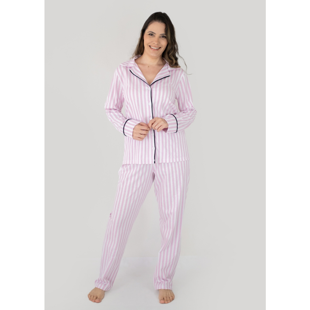 Pijama Feminino Americano Longo Algodão Amamentação Pós- Cirúrgico - Listrado Rosa