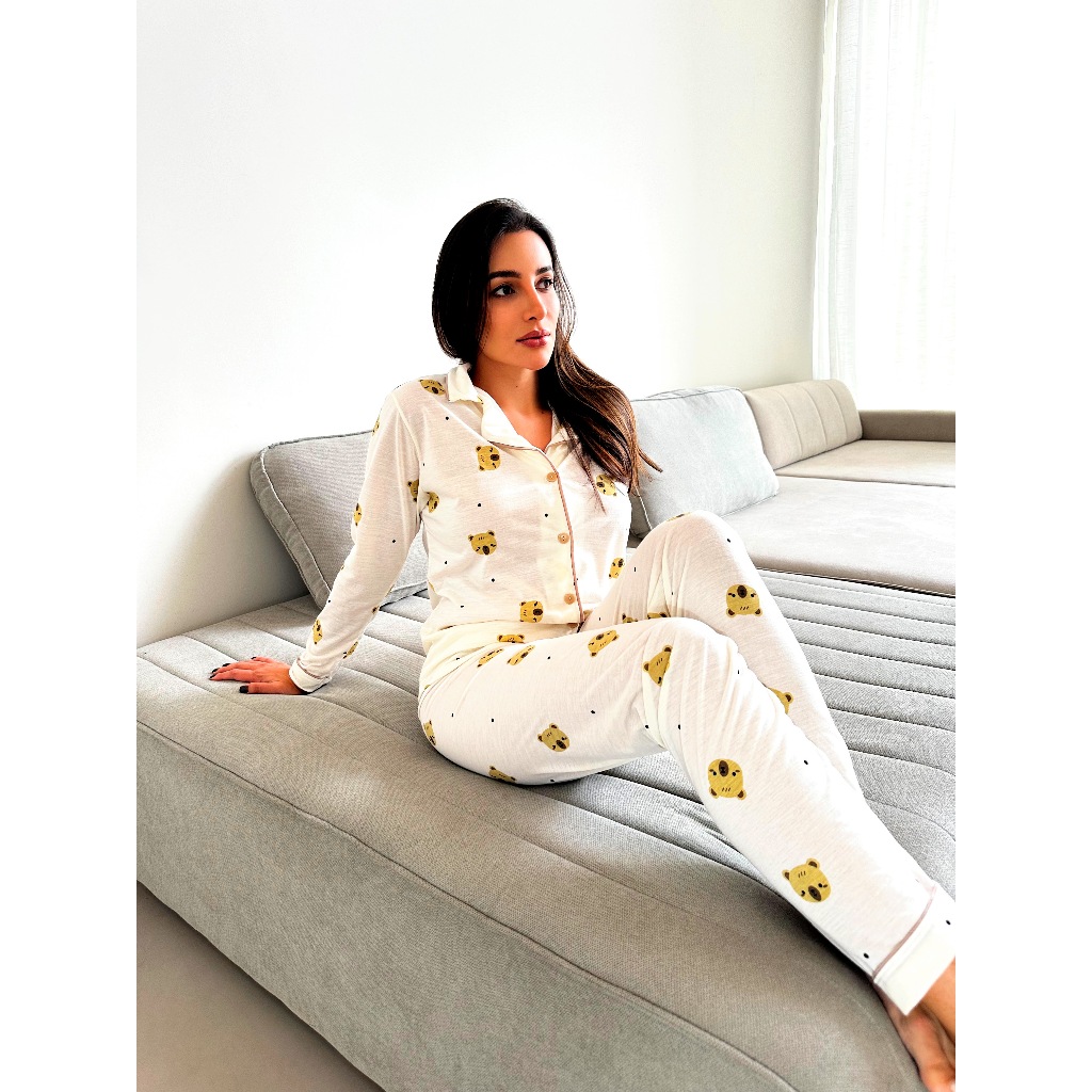 Pijama blogueirinha em malha poliviscose estampado Perfeito para noites um pouco mais frias. Lindo e confortável! Muito útil para gestantes e lactantes devido aos botões, que são totalmente funcionais. Tamanhos P veste 36/38 M veste 40 G veste 42/44 GG veste 44/46