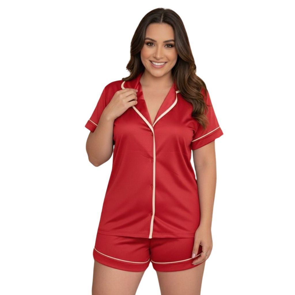 Pijama Feminino De Verão Americano com Gola Manga Curta e Short Conjunto de Dormir