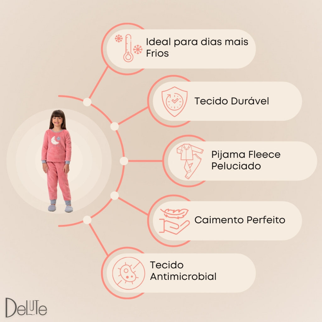 Pijama Feminino Infantil Fleece Night - Bela Notte. O pijama infantil fleece peludinho oferece aconchego e conforto para as meninas. Com sua capacidade de reter o calor corporal, o pijama em fleece é a escolha perfeita para enfrentar as baixas temperaturas do inverno. Com decote e punhos, uma adorável estampa de lua e estrela acompanhada da mensagem "Good Night", este pijama é simplesmente irresistível para as meninas. - Tecido Fleece Peluciado. - Punho e Barra com elástico. - Tecido Antimicrobial. - Tecido durável. - Caimento perfeito. - Modelo veste 6. - Não acompanha Pantufa. Composição: Poliéster 100%