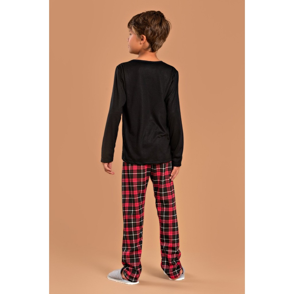 Pijama confeccionado em 100% poliéster na blusa e calça, parte superior com estampa de bolso xadrez vermelho falso e inferior com estampa rotativa em xadrez. • Composição Camisa: 100% Poliéster • Estação: Inverno • Faixa Etária: 4 a 14 anos de idade • Tipo: Fofo • Gênero: Masculino Infantil • Cor: Preto • Composição Calça/Shorts: 100% Poliéster