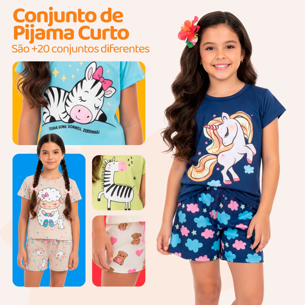 Pijama Infantil Feminino Verão – Manga Curta + Bermuda | 100% Poliéster** Conforto e leveza para noites tranquilas e divertidas O **pijama infantil Feminino de verão** foi desenvolvido para oferecer conforto e liberdade em noites quentes. Com **tecido leve e toque suave**, é ideal para o dia a dia, proporcionando frescor e bem-estar para o seu pequeno. Neste anúncio, o comprador pode **escolher entre mais de 10 modelos diferentes**, com estampas alegres e divertidas. Monte o kit ideal de acordo com o gosto e estilo da criança. --- Detalhes do Produto - Camiseta de **manga curta**, com gola reforçada - Bermuda com **elástico confortável na cintura** - Confeccionado em **100% poliéster** – leve, macio e de secagem rápida - Estampas exclusivas com temas infantis - Ideal para o verão e dias de calor --- Tabela de Medidas Camiseta* Tam 1 – Busto 26 cm | Comprimento 35 cm Tam 2 – Busto 27 cm | Comprimento 37 cm Tam 3 – Busto 28 cm | Comprimento 38 cm Tam 4 – Busto 32 cm | Comprimento 45 cm Tam 6 – Busto 35 cm | Comprimento 46 cm Tam 8 – Busto 36 cm | Comprimento 49 cm Tam 10 – Busto 36 cm | Comprimento 52 cm Bermuda Tam 1 – Cintura 20 cm | Comprimento 26 cm Tam 2 – Cintura 21 cm | Comprimento 27 cm Tam 3 – Cintura 19 cm | Comprimento 27 cm Tam 4 – Cintura 24 cm | Comprimento 33 cm Tam 6 – Cintura 25 cm | Comprimento 34 cm Tam 8 – Cintura 24 cm | Comprimento 36 cm Tam 10 – Cintura 25 cm | Comprimento 37 cm *Pode haver pequena variação (±2 cm) devido ao processo de confecção.* --- Benefícios do Produto - Tecido leve e respirável - Conforto e liberdade para brincar e dormir - Secagem rápida e fácil manutenção - Estampas variadas com temas divertidos - Perfeito para o verão e climas quentes --- Dica Adicione mais de um modelo ao carrinho e **aproveite o mesmo frete** para montar um kit completo e variado de pijamas para o sua Filha. --- Perguntas Frequentes 1. Posso escolher o modelo? Sim. Basta selecionar o modelo desejado no momento da compra. 2. O tecido é quente? Não. O poliéster é leve e fresco, ideal para noites de verão. 3. A bermuda tem elástico? Sim. Todas as bermudas possuem elástico confortável e ajustável na cintura. 4. As estampas desbotam com o tempo? Não. O tecido é resistente e mantém as cores vivas mesmo após diversas lavagens.