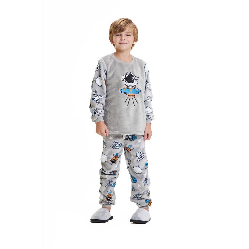 Pijama Inverno Longo Dias Frios Infantil Fleece Plush Menino Básico Ted Com Punho Astronauta Cinza