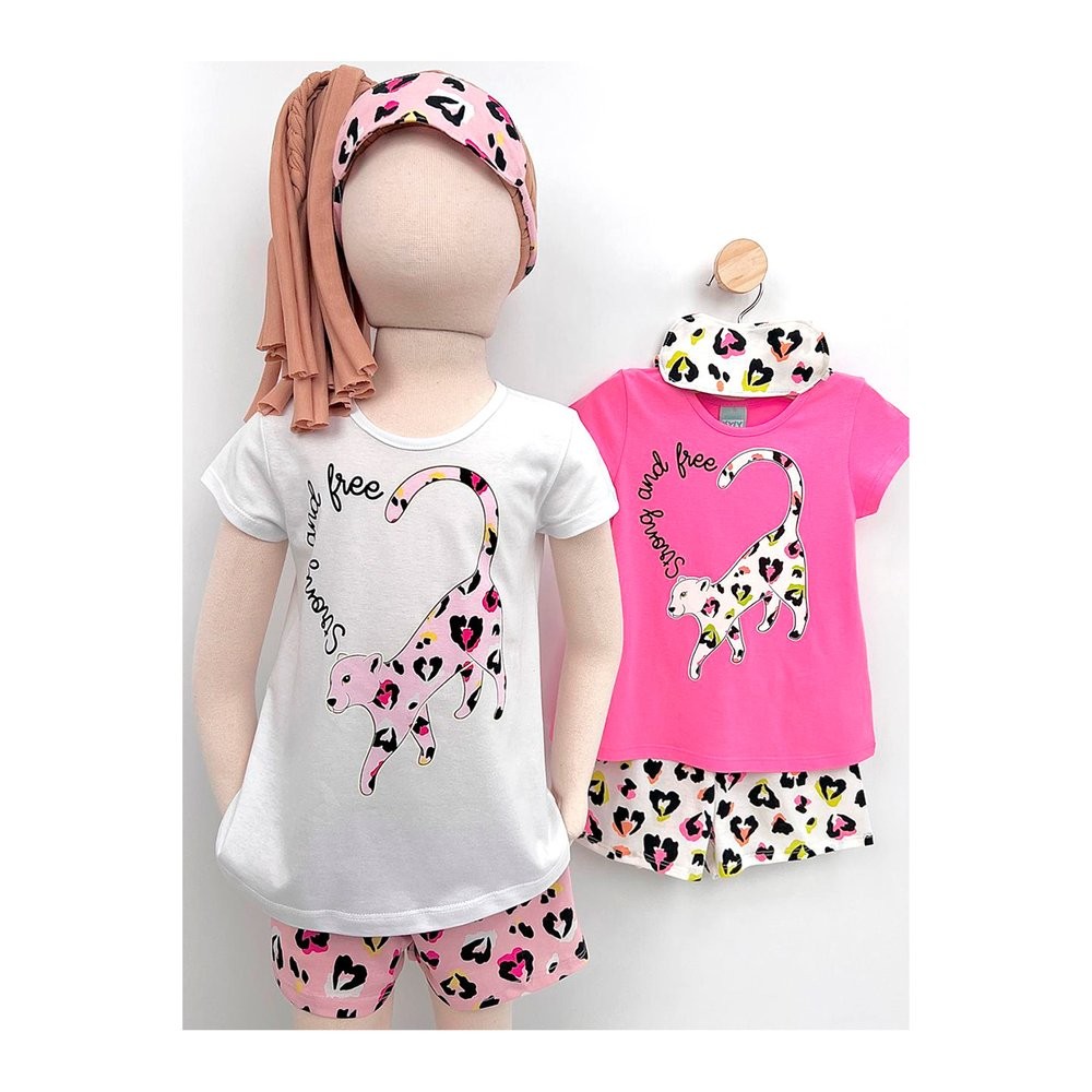 Pijama Menina Tigresa Brilha no Escuro com Máscara - Kyly O pijaminha apresenta estampa de trigresa com escritas. Descoladinho, ele apresenta blusa com manga curta, gola redonda e modelagem soltinha no comprimento. O short possui cós em elástico e traz estampa animal print! Acompanha máscara de olhas para uma perfeita noite de sono sem interferência de claridade! Com detalhes que brilham no escuro, ele é o lookinho perfeito para a festa do pijama! Características Gerais do Produto: • Composição Parte de Baixo: 100% algodão • Composição Parte de Cima: 100% algodão • Cor: Branco e Rosa • Gênero: Feminino • Fechamento: Cós em elástico • Manga: Manga Curta • Modelagem: Normal • Outros: Brilha no Escuro - Conforto garantido! Modelagem padrão. Consulte a tabela de medidas.