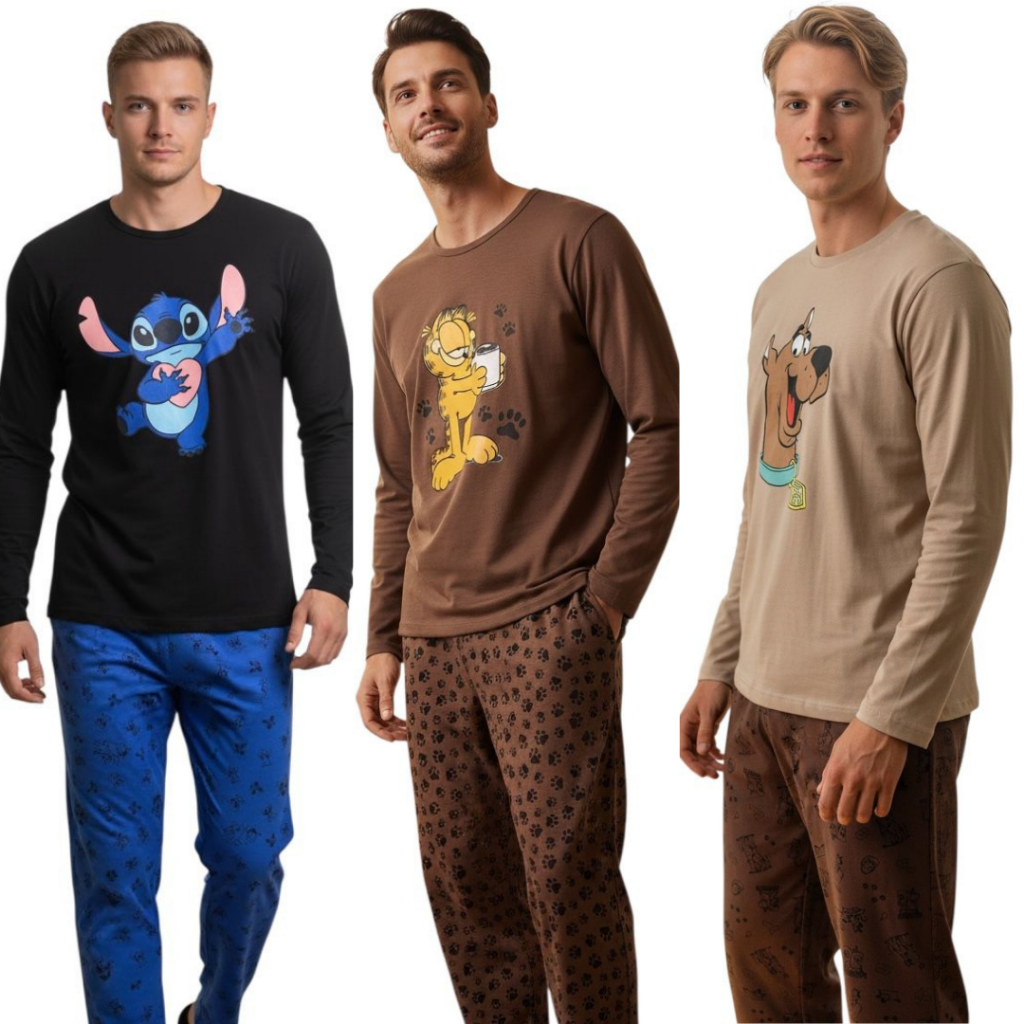PIJAMAS ADULTO MASCULINO PERSONAGENS MANGA LONGA INVERNO