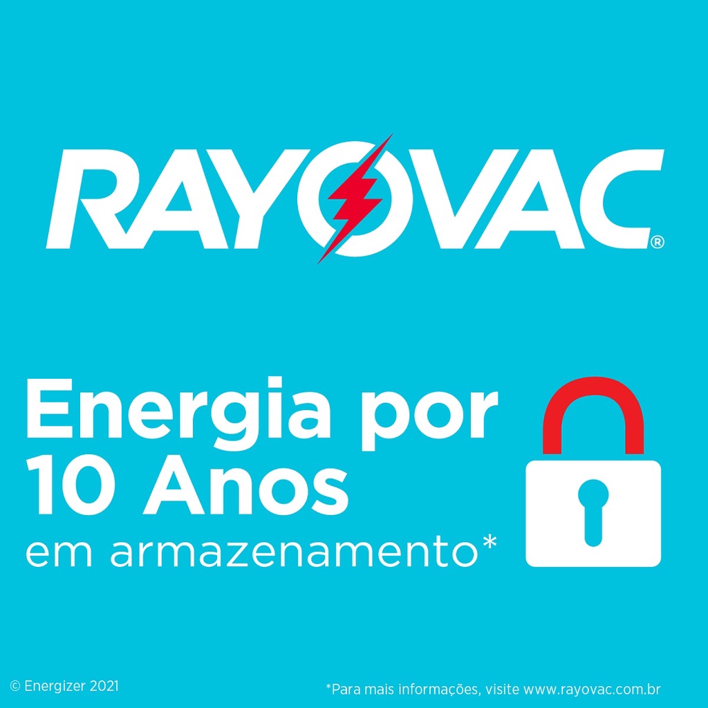 As pilhas alcalinas Rayovac entregam longa duração e alta performance em dispositivos de alto consumo de energia, como brinquedos, lanternas etc. Possuem 10 anos de validade: Garantimos que, se não utilizadas, as pilhas podem ser armazenadas por até 10 anos mantendo no mínimo, 60% da carga. Livres de mercúrio e cádmio.