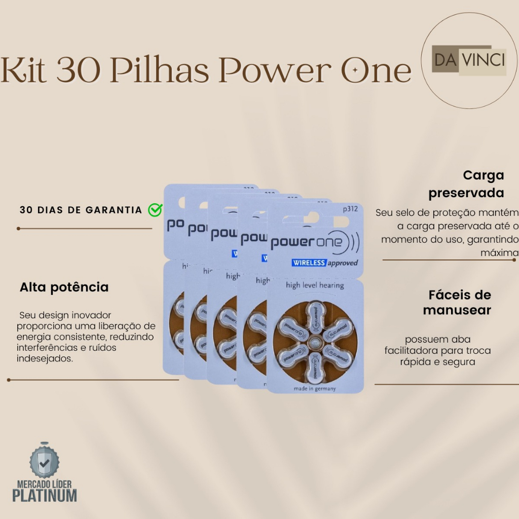 A Pilha Auditiva Power One 312 (kit 30) é a escolha ideal para quem busca desempenho e durabilidade em aparelhos auditivos. Fabricada na Alemanha com tecnologia de ponta, ela oferece alta potência, garantindo um som claro e estável por mais tempo. Seu design inovador proporciona uma liberação de energia consistente, reduzindo interferências e ruídos indesejados. Com ótima relação custo-benefício, as pilhas Power One 312 são livres de mercúrio, tornando-se uma opção segura e ecologicamente correta. Além disso, seu selo de proteção mantém a carga preservada até o momento do uso, garantindo máxima eficiência. Cada embalagem contém seis pilhas do tipo 312 (PR41), compatíveis com diversos modelos de aparelhos auditivos. Fáceis de manusear, possuem aba facilitadora para troca rápida e segura.