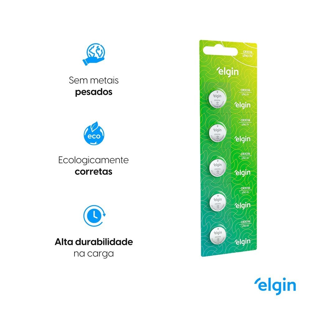 Pilha CR2016 3V Elgin Bateria Moeda 5 unidades