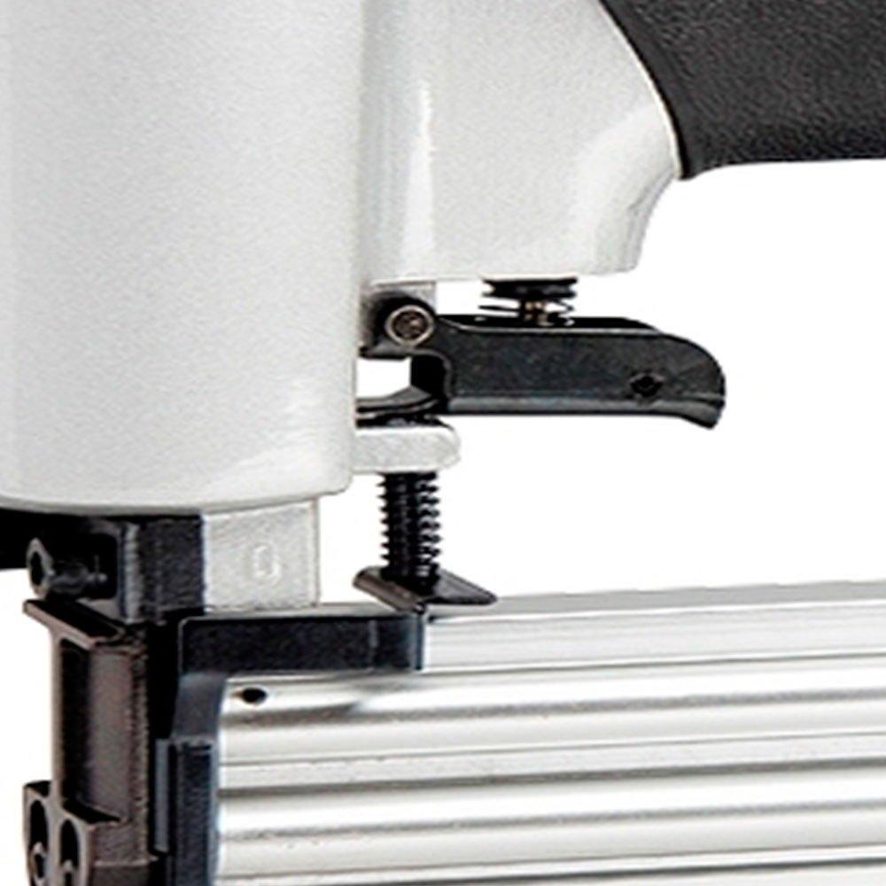 Pinador pneumático possui compartimento com capacidade de 100 pinos. Indicado para fixação de forma rápida e eficiente de pisos de madeira, madeira compensada, MDF, placas de gesso, couro, tecido e papel em superfícies de madeira. - Especificações técnicas: :: Faixa de pressão operacional: 65 110Psi :: Pinador pneumático :: Para pinos :: Capacidade: 10 - 50 mm - Garantia: 3 meses