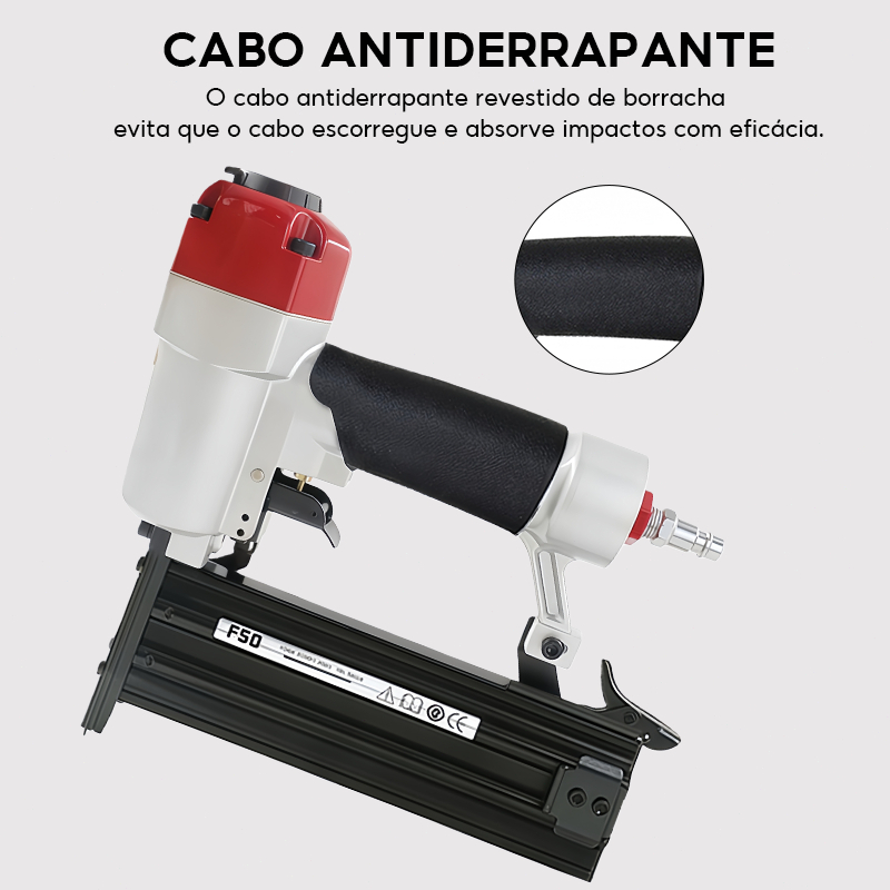 Diferenciais do Produto: Alta capacidade – Depósito para até 100 pinos, reduzindo interrupções no trabalho Construção robusta – Corpo em alumínio resistente, garantindo durabilidade e leveza Ergonomia avançada – Punho antiderrapante para maior conforto e controle Pressão de trabalho – 65 a 110 psi (0,55-0,76 MPa) para desempenho eficiente Leve e confortável – Com apenas 1,4 kg, reduz a fadiga em usos prolongados Especificações Técnicas: Modelo: F50 Tipo: Pneumático Capacidade do depósito: 100 pinos Tamanho dos pinos compatíveis: 10 a 50 mm (18GA) Pressão de operação: 65 a 110 psi (0,55-0,76 MPa) Conector de entrada: 1/4" NPT Peso aproximado: 1,4 kg Ideal para: ✔ Instalação de pisos, rodapés e revestimentos ✔ Montagem de móveis e trabalhos em MDF ✔ Fixação em compensado, gesso, couro e tecido