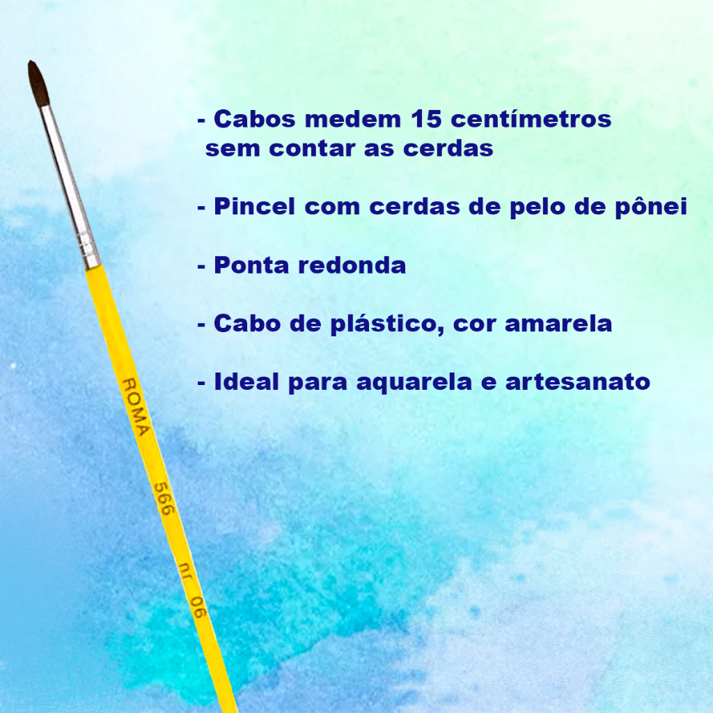 Pincel Artesanato Roma 566 Ponta Redonda Pelo De Ponei Número 0 ao 22 Pincéis de Artesanato Pintura Aquarela Roma 566 com Ponta Redonda Pelo Ponei - Cabos medem 15 centímetros, sem contar as cerdas - Pincel com cerdas de pelo de pônei - Ponta redonda - Cabo de plástico, cor amarela - Ideal para aquarela e artesanato CUIDADOS: - A ponta dos pincéis vem com uma goma protetora. Ao utilizar um pincel pela primeira vez, remova esta goma em água corrente - Evite deixar a tinta secar no pincel - Após o uso, retire o excesso de tinta e limpe com produto adequado ao tipo de tinta utilizada. Lave com água e sabão neutro, enxágue bem - Deixe secar completamente antes de guardar - Para evitar deformações, evite pressionar as pontas dos pincéis - Antes de efetuar a compra consultar o valor do frete - Frete por conta do comprador - Não nos responsabilizamos pelo mau uso do produto. - Atenção: As compras realizadas em nome de Pessoa Jurídica estão sujeitas a cobrança de ICMS, conforme Protocolo ICMS 41, de 4 de Abril de 2008. Caso você tenha dúvidas sobre o percentual a ser aplicado, consulte a Cláusula Segunda, §1° do referido Protocolo. - Em caso de dúvidas use o campo de Perguntas. Fotos meramente Ilustrativas. Caso tenha dúvidas quanto a utilização deste produto, favor consulte-nos pelo campo de perguntas. CÓD. REFERÊNCIA: 015738 - 015739 - 015740 - 015741 - 015742 - 015743 - 015744 - 015745 - 015746 - 015747 - 015748