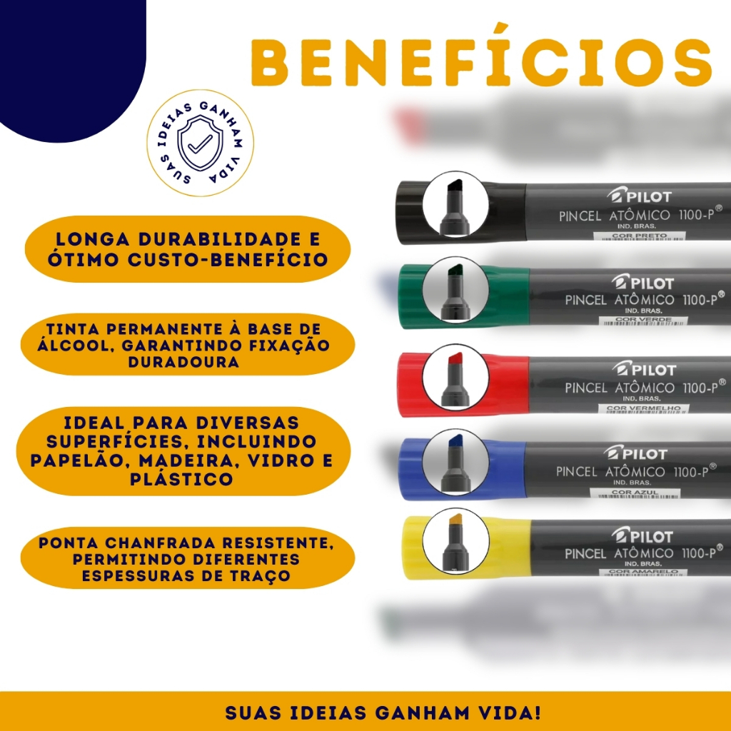 Kit Pincel Atômico Pilot 1100-P (5 Cores) Referência em marcadores no Brasil, o Pincel Atômico apresenta um excelente custo-benefício graças as suas diversas funcionalidades e longa durabilidade de sua tinta. Indicado para marcar, escrever e até mesmo desenhar. Possui ponta chanfrada de feltro resistente que não deforma, por isso, é ideal para superfícies rústicas como papelão e madeira. Contudo, também é indicado para o uso em diversos tipos de papéis, cartolina, vidros, metais e plásticos. Sua ponta chanfrada de feltro permite escritas em diferentes espessuras, como 2.0mm, 4.5 mm e 8.0mm. Possui tinta permanente a base álcool e pode ser recarregado com a tinta Pilot TR 37 ou TR 500. Especificações - Ponta de Feltro - Super resistente - Ideal para superfícies rústicas - Recarregável - Ponta Chanfrada - Kit 5 Cores: Azul, Verde, Vermelho, Preto e Amarelo - Marca: Pilot