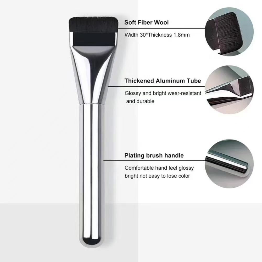 Pincel de base ultrafino, leve e fino, pincel para contorno de rosto Características: 1. Pincel de base ultrafino e plano. Não coma pó. 2. Lã de fibra macia, de alta qualidade, dá um toque sedoso. 3. Pode aplicar rapidamente um efeito de maquiagem uniforme e natural! 4. A cabeça do pincel ultrafina e curta e plana é mais fácil de controlar e pode aplicar maquiagem rapidamente sem deixar vestígios. Especificações: Nome:Pincel de base ultrafino Material: lã de fibra + cabo de metal Tipo de pele:Geral Pessoas aplicáveis:Geral