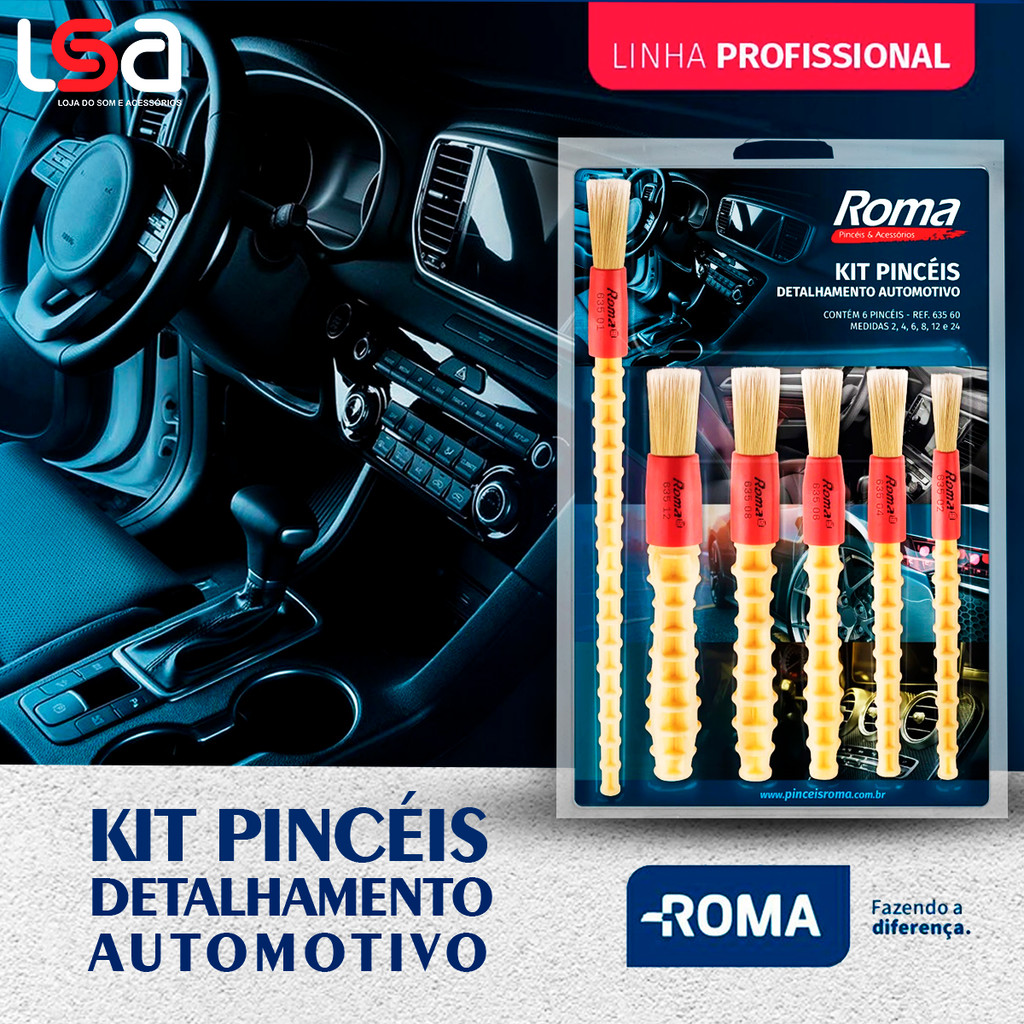 Pincel de Limpeza/ Estética Automotiva Detalhamento Roma Kit 6 ou unidade Pincel ROMA São altamente elogiados pela sua qualidade e eficácia. Destacam se pela resistência e facilidade de uso. São ideais para area Externa e Interna do carro, sendo eficientemente a limpeza poeira do painel. -Internas: Painel, saída do ar condicionado, soleiras e cantos dos vidros -Externas: Rodas, dobradiças, grades, cantos de faróis e limpeza de motor KIT PINCÉIS DE DETALHAMENTO AUTOMOTIVO ROMA - 1 UN PINCEL 02 - 1 UN PINCEL 04 - 1UN PINCEL 06 -1 UN PINCEL 08 -1 UN PINCEL 12 - 1 un PINCEL 24 DESCRIÇÃO: Possui cerdas claras e macias para não danificar as superfícies a serem limpas. Recomendado para limpeza das peças internas e externas do veículo. APLICAÇÃO: - Partes internas como saída de ar condicionado, soleiras, parafusos, cantos de vidros, painel, cartões de porta e muito mais. - Para externas como emblemas, grades, cantos de faróis e limpeza de motor. OBS: Apesar de possuir cerdas macias o pincel não é recomendado para limpeza de LCD, acrílico transparente e peças sensíveis. * Alguns pinceis podem soltar cerdas por conta do excesso durante a fabricação, fazer a limpeza antes do uso. Cerdas sintéticas com pontas extra finas facilitando a limpeza sem agredir a superfície. Também oferecem maior resistência ao desgaste e durabilidade do produto.