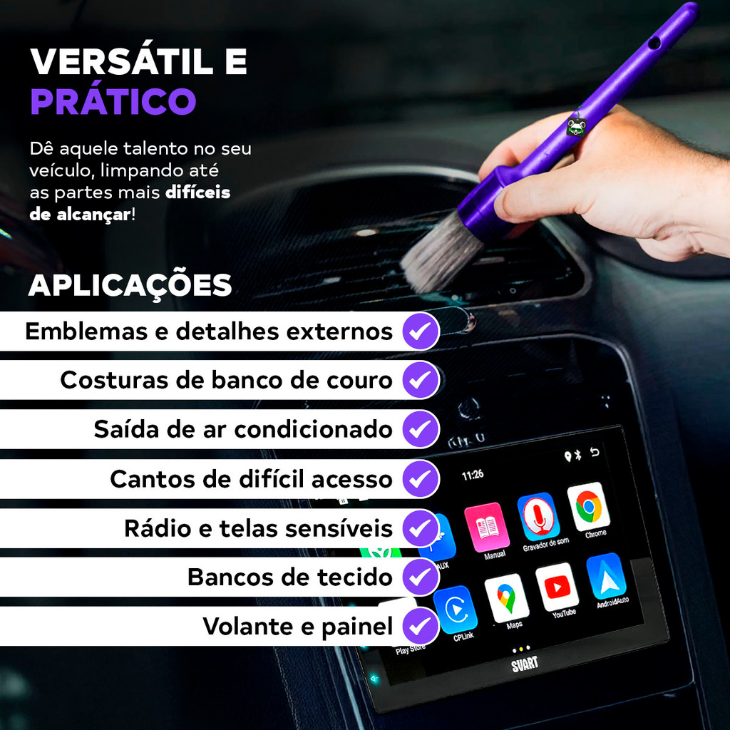 Bem-vindo a Koala Parts! A sua escolha certa para peças e acessórios automotivos - Há mais de 10 anos oferecendo qualidade e confiança. Pincel Detalhamento Automotivo Interno N°14 Unitário Zacs Vonixx PRECISÃO E CUIDADO DE DENTRO PRA FORA A limpeza ideal para áreas internas e delicadas do veículo, como volante, rádio, telas, saída de ar condicionado, painel e muito mais. O Pincel de Detalhamento Interno tamanho 14 combina cerdas suave de alta qualidade e um cabo alongado, projetado para maior precisão e facilidade para alcançar cantos difíceis. Pode ser utilizado seco ou levemente úmido com produtos de limpeza automotiva. • Cabo longo para maior alcance • Resistente a produtos químicos • Cerdas suaves e flexíveis APLICAÇÕES - Interior do veículo - Costuras de banco de couro - Saída de ar condicionado - Bancos de tecido - Volante e painel - Rádio e telas sensíveis - Emblemas e detalhes externos - Cantos de difícil acesso O pincel possui cerdas sintéticas de Polibutileno Tereftalato (PBT), material que se destaca pela alta resistência, durabilidade e precisão. É ideal para limpeza técnica, pois não deforma com facilidade, resiste a produtos químicos e seca rapidamente por não absorver água; Um material perfeito para quem busca eficiência e longa vida útil em escovas e pincéis automotivos. CERDAS SUAVES E MACIAS Feitas em PBT (Polibutileno Tereftalato) que não riscam as superfícies, ideal para limpeza detalhada de partes internas e delicadas. FACILIDADE DE ALCANCE Cabo fino e alongado permite acessar áreas profundas e de difícil alcance com facilidade VERSATILIDADE DE USO Pode ser usado em diversos locais em peças secas ou úmidas. CABO RESISTENTE Feito em Polipropileno resistente e com furo no cabo para pendurar o pincel de forma prática. COMO USAR: [Para uso seco] 1. Deslize o pincel sobre superfícies compatíveis afim de retirar poeira e pequenas sujeiras. [Para uso úmido] 1. Molhe as cerdas no produto a ser utilizado para a limpeza para que fique levemente úmido; 2. Faça movimentos circulares na peça aplicando leve pressão, 3. Enxágue o pincel após o uso. Dica: - Pode ser utilizado na pintura e em detalhes cromados do exterior do veículo. ATENÇÃO! - Não aplique muita força ao utilizar o pincel afim de preservar as cerdas. ESPECIFICAÇÕES TÉCNICAS: - Material das Cerdas: Polibutileno Tereftalato (PTB) - Material do Cabo: Polipropileno (PP) - Tamanho: 4,5 x 2,3cm x 22cm - Número do Pincel: 14 CONTEÚDO DA EMBALAGEM: - 01. Pincel de Detalhamento Interno nº14 Vonixx