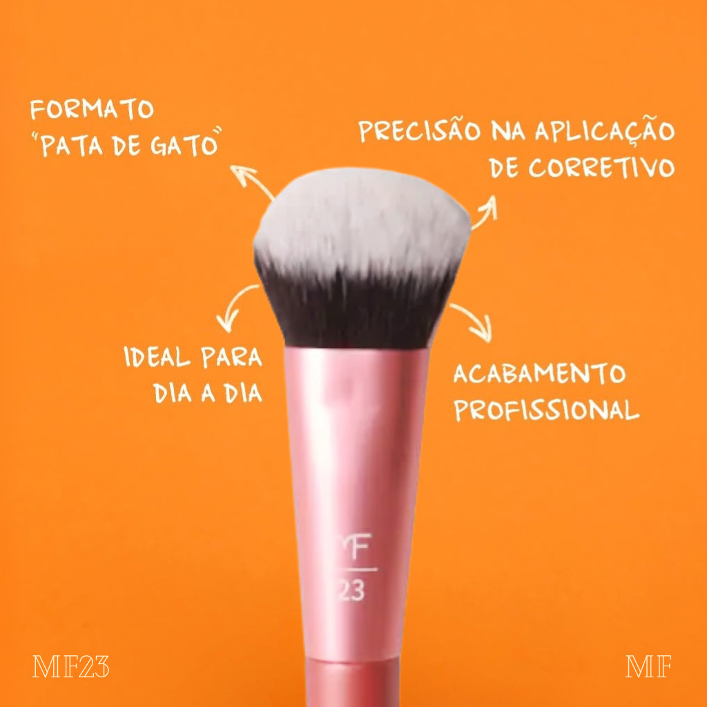 Pincel pata de gato P MF23 - Linha Squad O Pincel pata de gato P MF23 da linha Squad entrega precisão e controle para as áreas menores. Suas cerdas macias e formato achatado permitem uma aplicação uniforme, proporcionando um toque de cor natural e esfumado perfeito. Leve e ergonômico, é indispensável para finalizar a maquiagem com elegância.