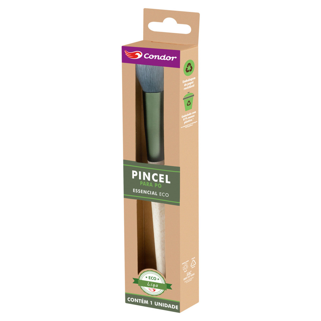 O pincel para pó Essencial Eco Condor é ideal para pós soltos e compactos, suas cerdas sintéticas grandes e volumosas esfumam com facilidade, deixando a make sem marcações, com um acabamento uniforme e natural. Seu cabo é composto por palha de trigo e material sintético, que o torna sustentável e permite uma aplicação leve e suave. Embalagem de papel reciclável: embalado com 87% menos plástico (comparado com embalagens 100%plásticas. Modo de uso: Com o pincel, pegue um pouco do pó de sua preferência, remova o excesso, e aplique distribuindo o produto por todo o rosto de maneira uniforme, principalmente na zona T (testa, nariz e queixo).