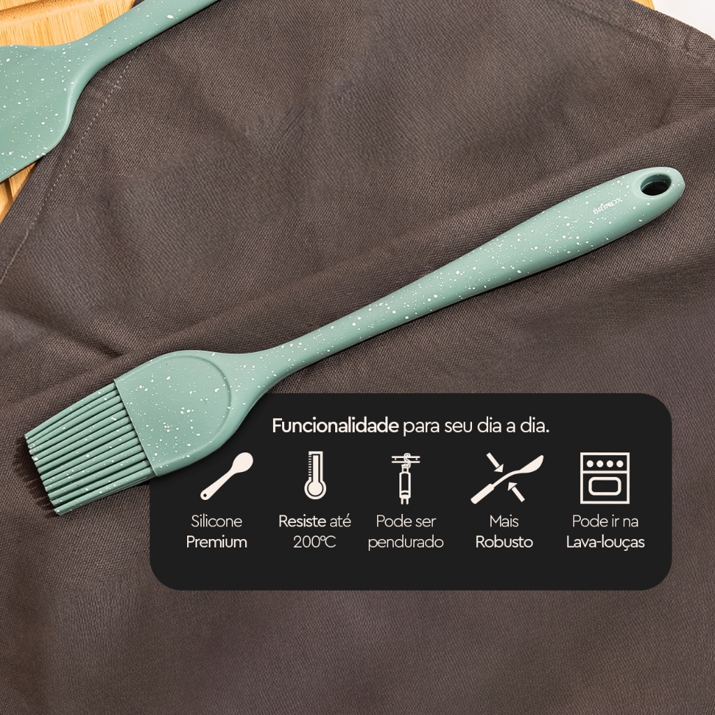 Seja Bem-Vindo(a) à Mimorada! Parceiro perfeito para finalizar seus pratos com requinte e sofisticação, o Pincel de Silicone da Linha Flex/Brinox serve para untar formas, espalhar azeite, manteiga e gema de ovo sobre os alimentos. Com a resistência ideal para pincelar os alimentos de forma rápida e uniforme, o Pincel Flex permite adicionar a quantidade correta de gordura em seus pratos. Com os utensílios corretos, é possível despertar seu lado chef da cozinha todos os dias. O Pincel de Silicone da Linha Flex/Brinox é um produto versátil, aumenta a vida útil e mantém a qualidade das formas e panelas com revestimento antiaderente, pois não causa danos às superfícies antiaderentes. Este Pincel de Silicone da Linha Flex é fabricado na cor Verde com grânulos Brancos, trazendo sensação de natureza, harmonia e bem-estar à decoração. Com 28 centímetros de comprimento, o utensílio ainda pode ser pendurado para deixar tudo sempre à mão. Suas cerdas de que não soltam ou deformam, mesmo quando submetido a altas temperaturas, pois suportam até 200ºC. Testado e aprovado pelos cozinheiros mais exigentes, o Pincel de Silicone Flex é fácil de limpar e pode até ser levado à lava-louças. Para deixar sua casa ainda mais bonita e completa, aproveite para adquirir as panelas da Linha Botanika, que são da mesma tonalidade dos utensílios da Linha Flex, que ainda inclui itens como espátula, concha e pegadores, entre outros. O Pincel de Silicone 28 cm da Linha Flex faz parte do conjunto de utilidades domésticas da Brinox. São itens para o dia a dia e para ocasiões especiais. Tudo fabricado com os mais rigorosos padrões de qualidade técnica e responsabilidade ambiental. Os produtos Brinox agregam tecnologia, sofisticação e sustentabilidade.
