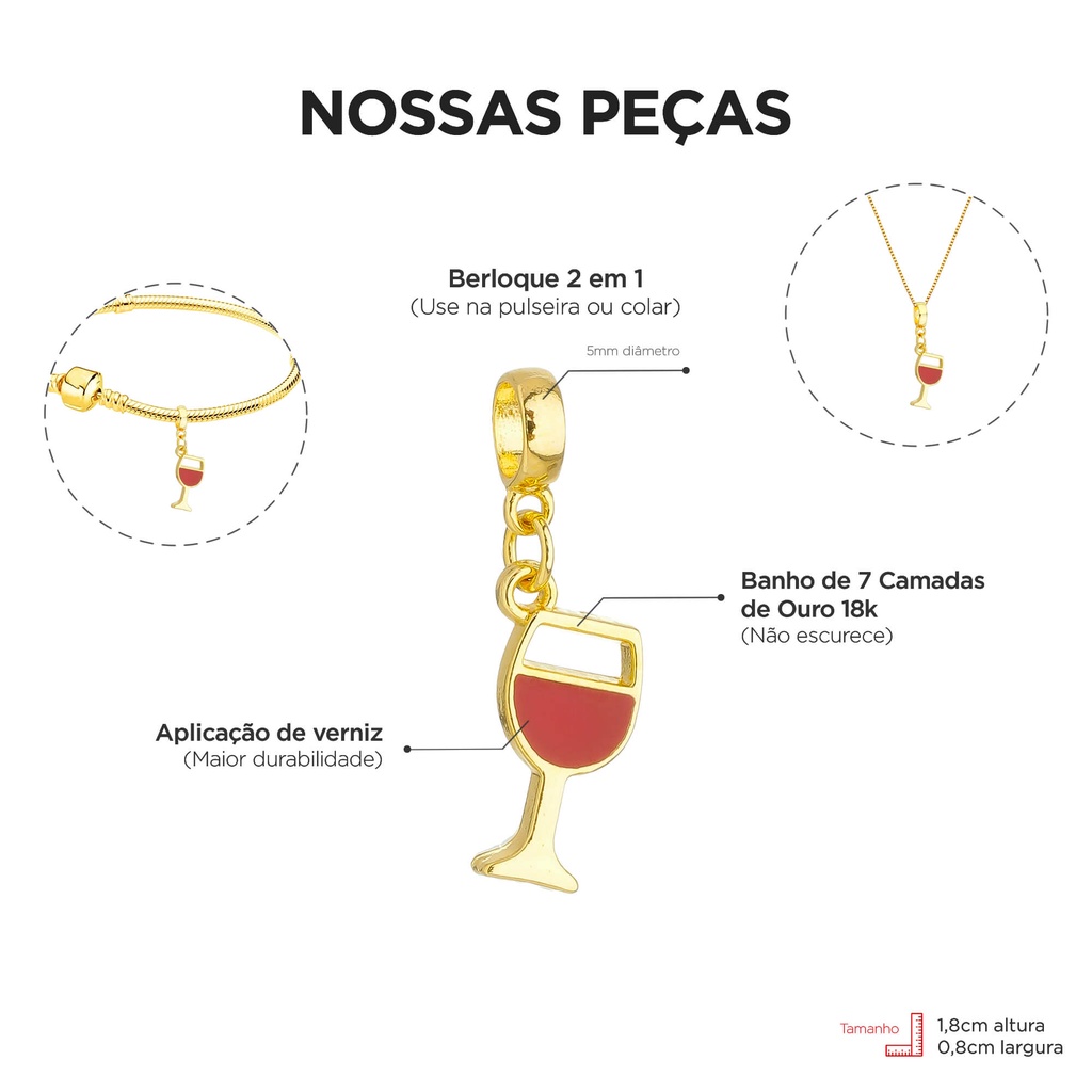 MODELO: Berloque de taça de vinho banhada com 7 milésimos de ouro 18k. DIMENSÕES: 1,8cm de altura 0,8cm de largura *Todos os pedidos acompanham uma caixinha, um saquinho de veludo e certificado de garantia. *Fotos reais e sem filtro. ********************************************************* PERGUNTAS FREQUENTES - Qual o material das semijoias? R: Todas as nossas peças são banhadas com 7 milésimos de ouro 18k ou 100 milésimos de prata 925. - Tem garantia? R: Sim! Damos 1 ano de garantia com certificado. Todas as peças são novas, fabricamos da fundição ao banho. - Elas escurecem? R: Não. Nossas peças são de ótima qualidade e também recebem aplicação de verniz, aumentando sua durabilidade. - É compatível com outras pulseiras? R: Sim. Nossos berloques são compatíveis com diversas pulseiras existentes no mercado. - Qual o prazo de envio? R: Até 24h úteis após a compra. ********************************************************* SOBRE A WORK SEMIJOIAS Somos uma fábrica de Semijoias Premium e a única do Brasil com berloques 2 em 1, onde você pode usar na pulseira e no colar. São mais de 1 mil modelos únicos para você escolher. Com 1 ano de garantia, nossas semijoias recebem controle de qualidade em todos os processos da produção, desde a fabricação do metal base, passando pelo acabamento, polimento, banho e finalmente a aplicação do verniz.