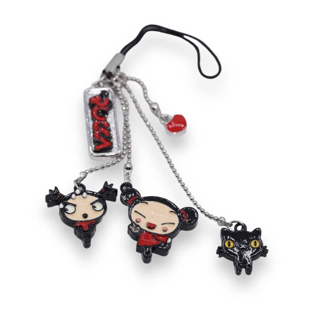 Pingente de celular Pucca PU0601 Ref.: PU0601 Comprimento do cordão: 4 cm Altura do pingente Pucca: 2,0 cm Altura do pingente Garu: 2,0 cm Altura do pingente gato Mio: 1,3 cm Altura do pingente coração: 0,5 cm Peso: 13 gramas Conteúdo: 1 unidade Material: metal e resina